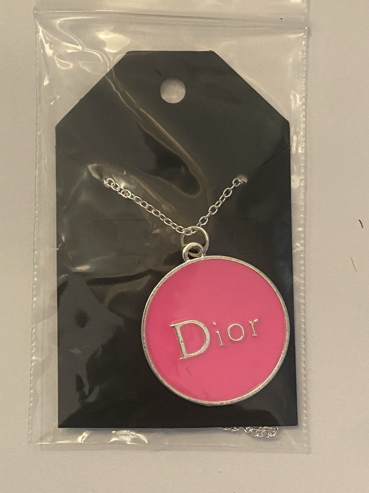 The Pink Dior Charm Necklace is a stylish accessory featuring a silver charm on an 18-inch chain. Made from metal alloy and manufactured in China, this necklace is a fashionable choice for adding a touch of luxury to any outfit. The charm adds a touch of glamour, making it a chic and elegant piece for any jewelry collection.