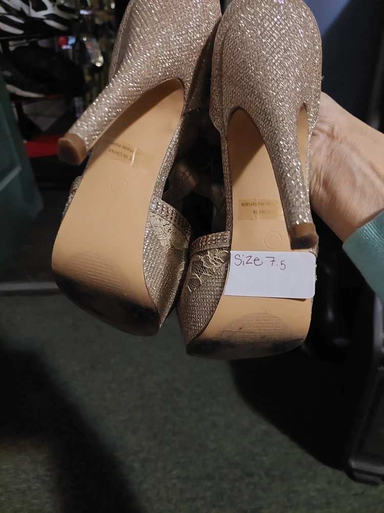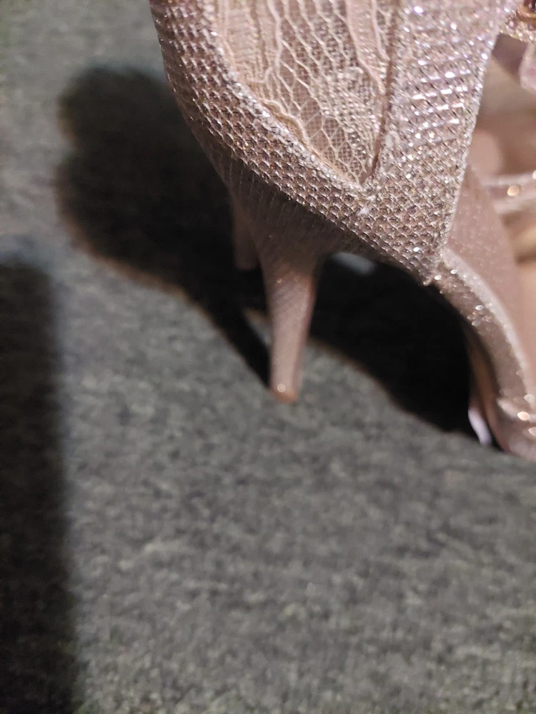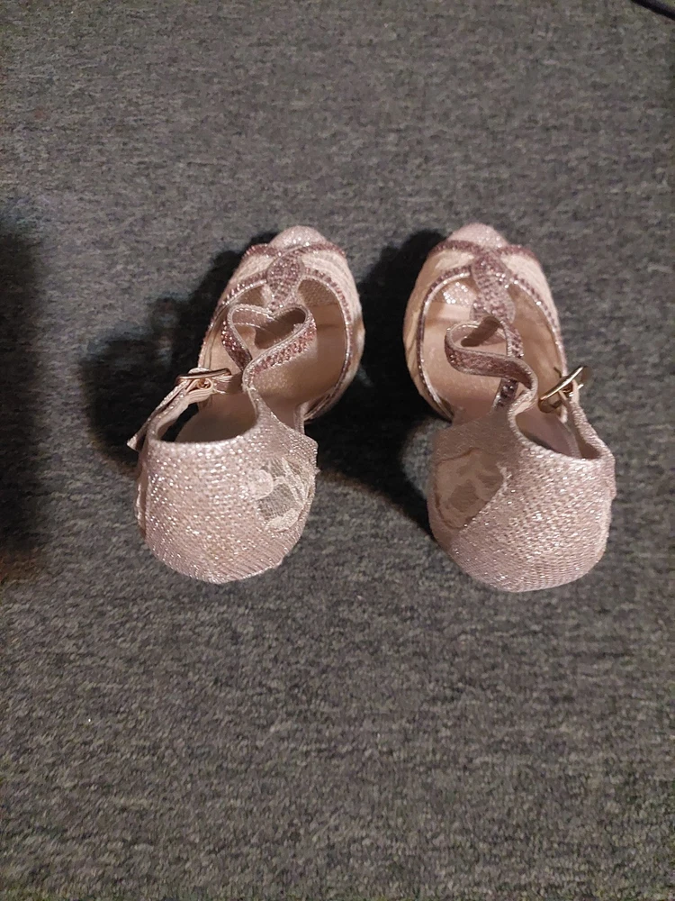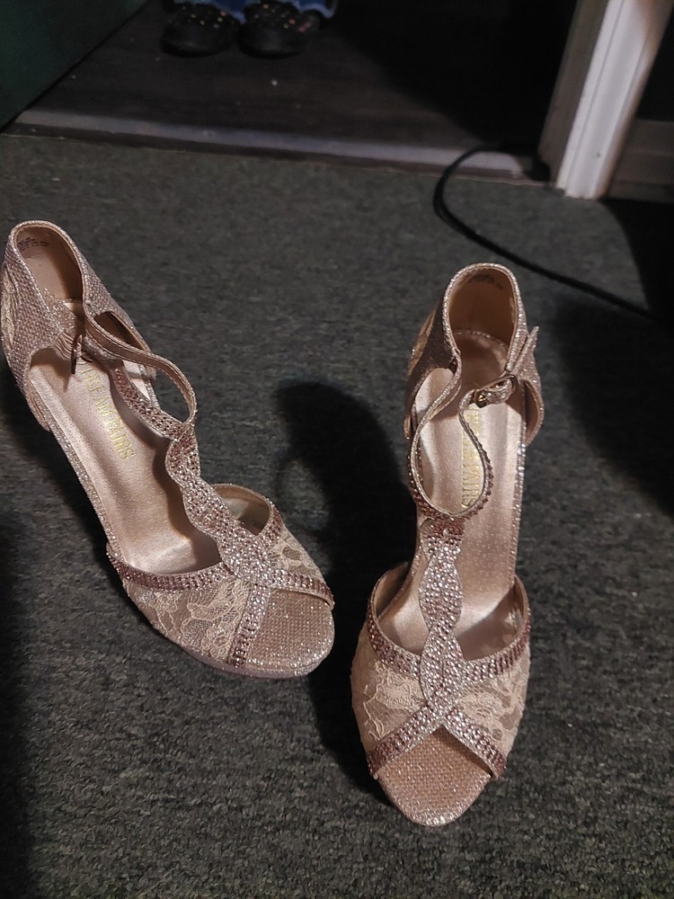 This is a pair of pink Dream Pairs dance shoes in size 7.5 for women. The heels are adorned with crystals, featuring a strappy style and made of synthetic material. Perfect for dancing or special occasions.