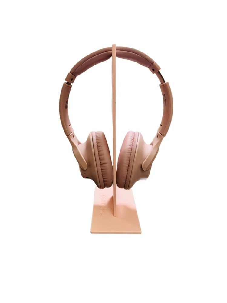 Pre-owned/in good condition - pink headphone stand made by Okinuma. It is made of a sturdy plastic material with a rectangular base and a curved top to hold the headphones in place. Headset has some marks due to use but still works great.