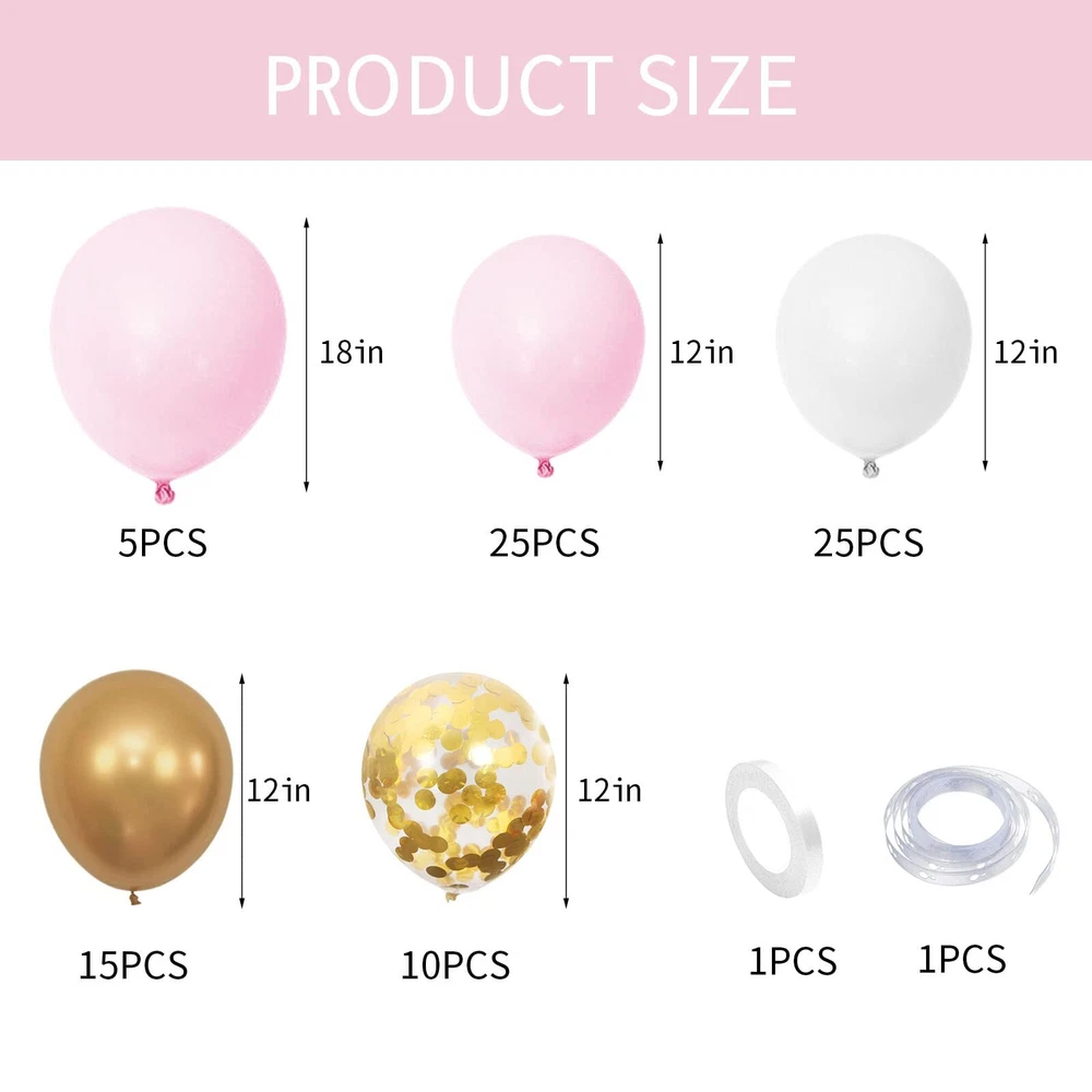 Pink Gold Balloon Garland Kit, 80Pcs Pink and Gold Latex Balloons Gold Confetti Balloons for Party Decorations Baby Shower Gender Reveal Anniversary Graduation Decorations FEATURES: Made of thicker latex material, durable and not easy to pop. Do not over-inflate the balloons, Inflate to 90% is the best. Adult supervision required for children to avoid choking danger. [PACKAGE INCLUDES]The party balloon arch kit include 25pcs 12inch light pink latex balloons, 25pcs 12inch white latex balloons, 15pcs 12inch chrome gold balloons, 10pcs 12inch white confetti balloons,5pcs 18inch light pink latex balloons and 1 roll balloon strip,1 roll ribbon [PREMIUM QUALITY MATERIAL] Made of premium natural latex material, the balloon is more thicker, durable and not easy to pop, long-lasting. Our birthday balloons are nontoxic and no odor, safe for your family, can be used for both kids and adults. [Easy use]Use balloon strip kit You can easily make balloon garland or arch. Simply assembly within 30 minutes, creative and liven up your parties with your awesome idea. You could DIY any style you like, DIY it as a balloon garland kit, or sticky on wall decoration, or tie up with ribbon strip, or put on table etc. [BALLOONS CAN BE FILLED WITH] Mixed size balloons can be filled with air or helium and last for several hours. Please DO NOT overfill the balloons and avoid sunburn, overheat, pointed object and excessive friction. [NOTE] Please do not overfill the balloon, and also avoid sunburn, overheating, sharp objects and excessive friction. Shipping from the USA All of our products are shipped from the USA, ensuring quick delivery to your destination. Payment We offer the following payment methods: PayPal, credit card, bank transfer, and eBay's secure payment system. Free Shipping & Free Returns Shipping within the USA is FREE. Additionally, any return is absolutely free for you. Risk-Free Purchase You have the option to return an item within 30 days without any justification. We cover the return shipping costs! Fast Shipping We ship immediately upon receipt of payment. Generally, the package is delivered within 2-3 days in the USA. If it takes longer, we will contact you. Quality and Costs Made in Europe, USA, China No customs fees or additional charges Total satisfaction guarantee Invoice with declared VAT available upon request in .pdf format Feedback Your feedback is very important to us. After you pay for your purchase, you will automatically receive positive feedback from us.