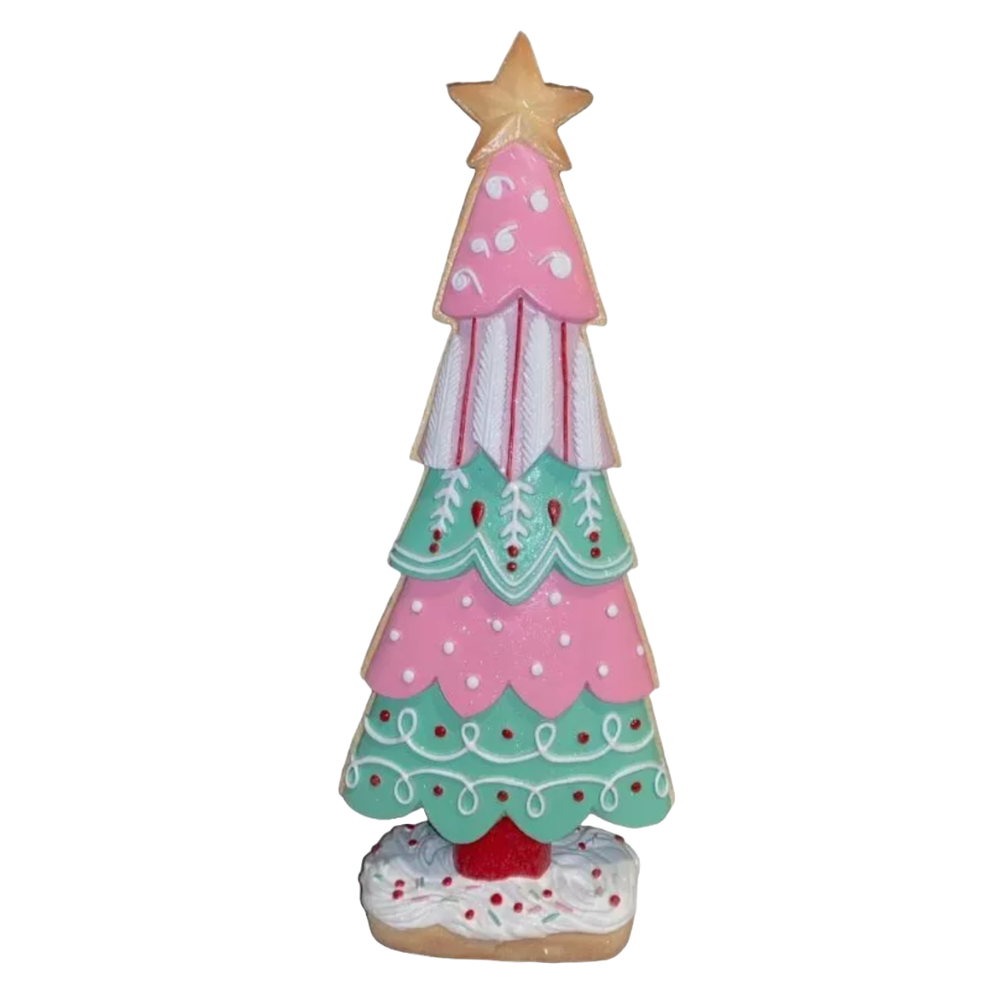 SARASOTA CHRISTMAS CO. NEW Pretty pink and mint green Christmas tree sugary finish table top decoration. Featuring colorful sprinkles and icing trim with a star topper. Measures: 15" high