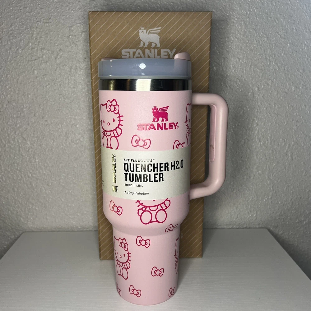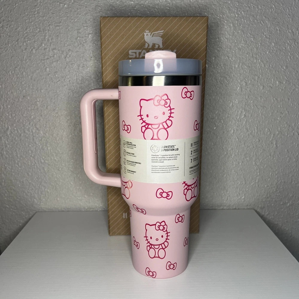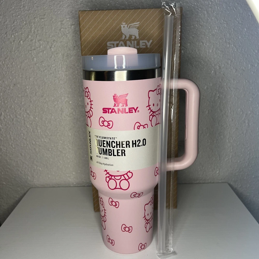 Brand new pink hello kitty engraved 40oz Stanley tumbler A great gift for any hello kitty lover This pink Hello Kitty engraved Stanley tumbler is the perfect addition to any kitchen or bar. With a 40 oz capacity, it keeps your hot or cold beverages at the perfect temperature for up to 7 and 11 hours, respectively. The tumbler is made of durable stainless steel and comes with a lid and straw, making it easy to sip on your favorite drink.