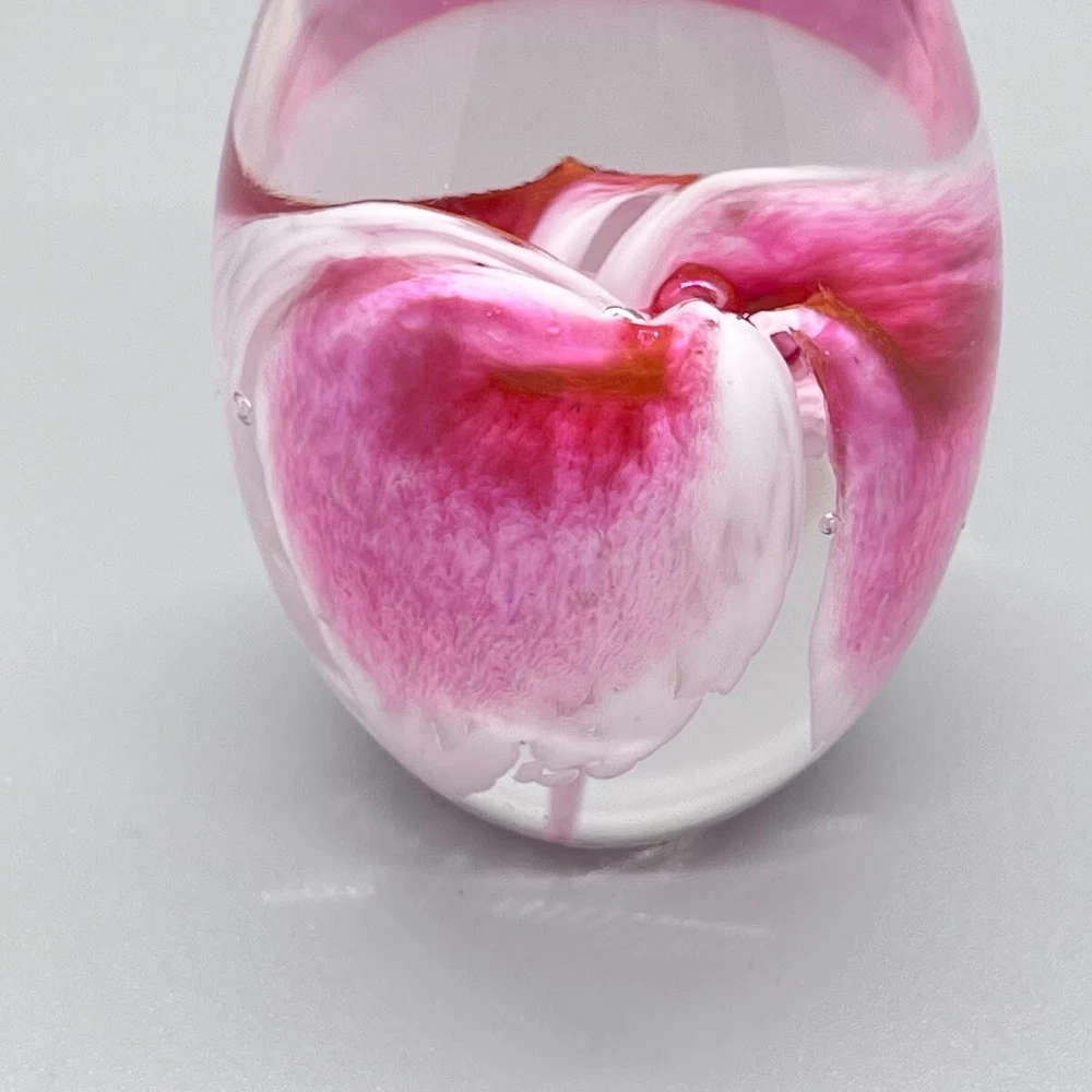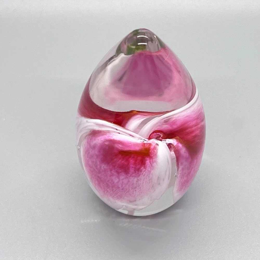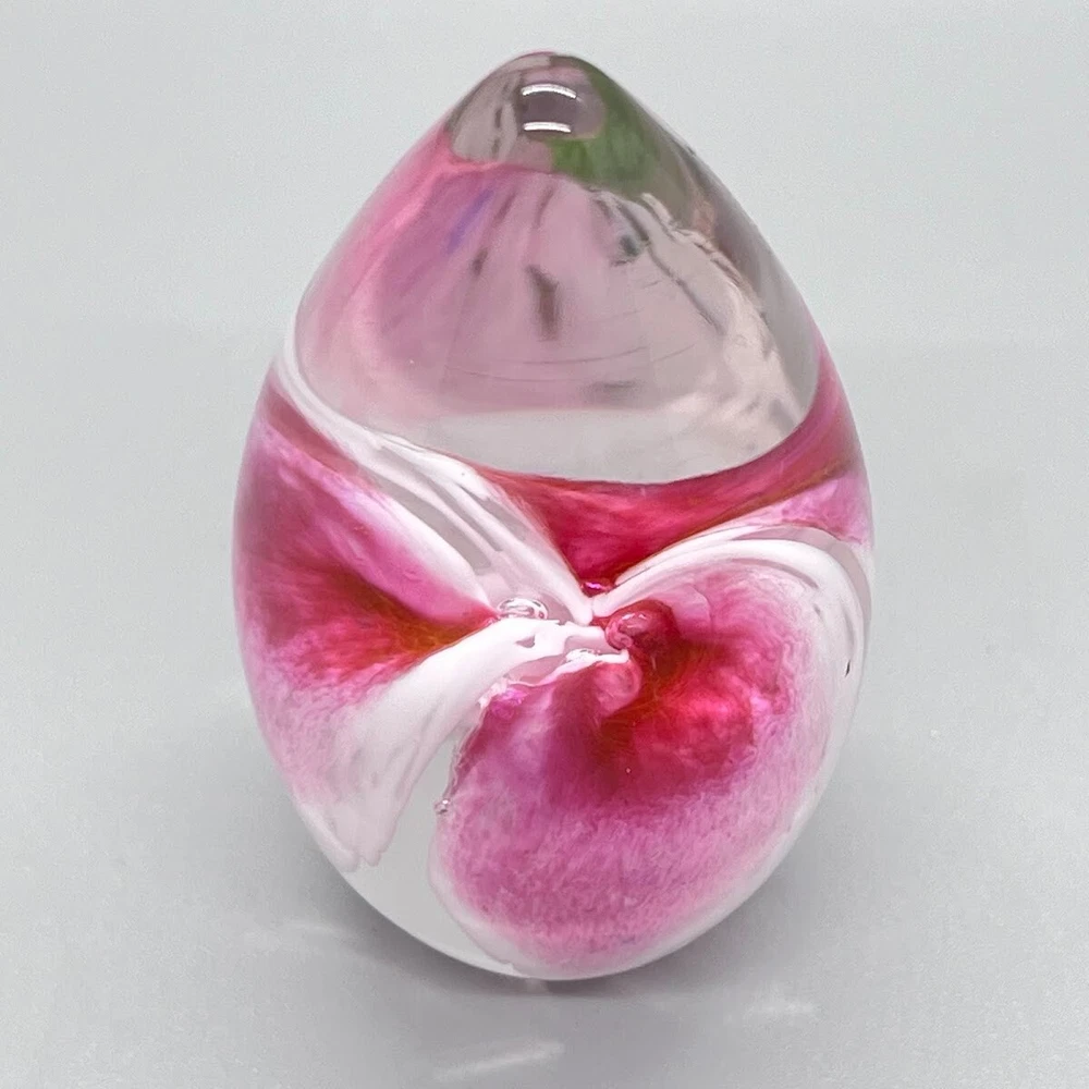 Pink Lily Paperweight Egg Shape Glass 3 Inches Tall Elevate your desk's charm with the Pink Lily Paperweight, a delightful addition to any collector's assortment or a thoughtful gift for someone who appreciates the elegance of art glass. This egg-shaped decorative piece, standing at a quaint 3 inches tall, is crafted from high-quality glass, showcasing a beautiful flower pattern that brings a touch of nature indoors. With its vibrant pink hue and intricate flower theme, this paperweight is not only functional but also serves as a stylish accent to your workspace or display shelf. Despite its unknown origin, the piece hails from the late 90s, adding a dash of vintage flair to your decor. Its artful design and glossy finish make it a standout accessory that blends sophistication with whimsy. 3" Tall x 1 1/2" Diameter