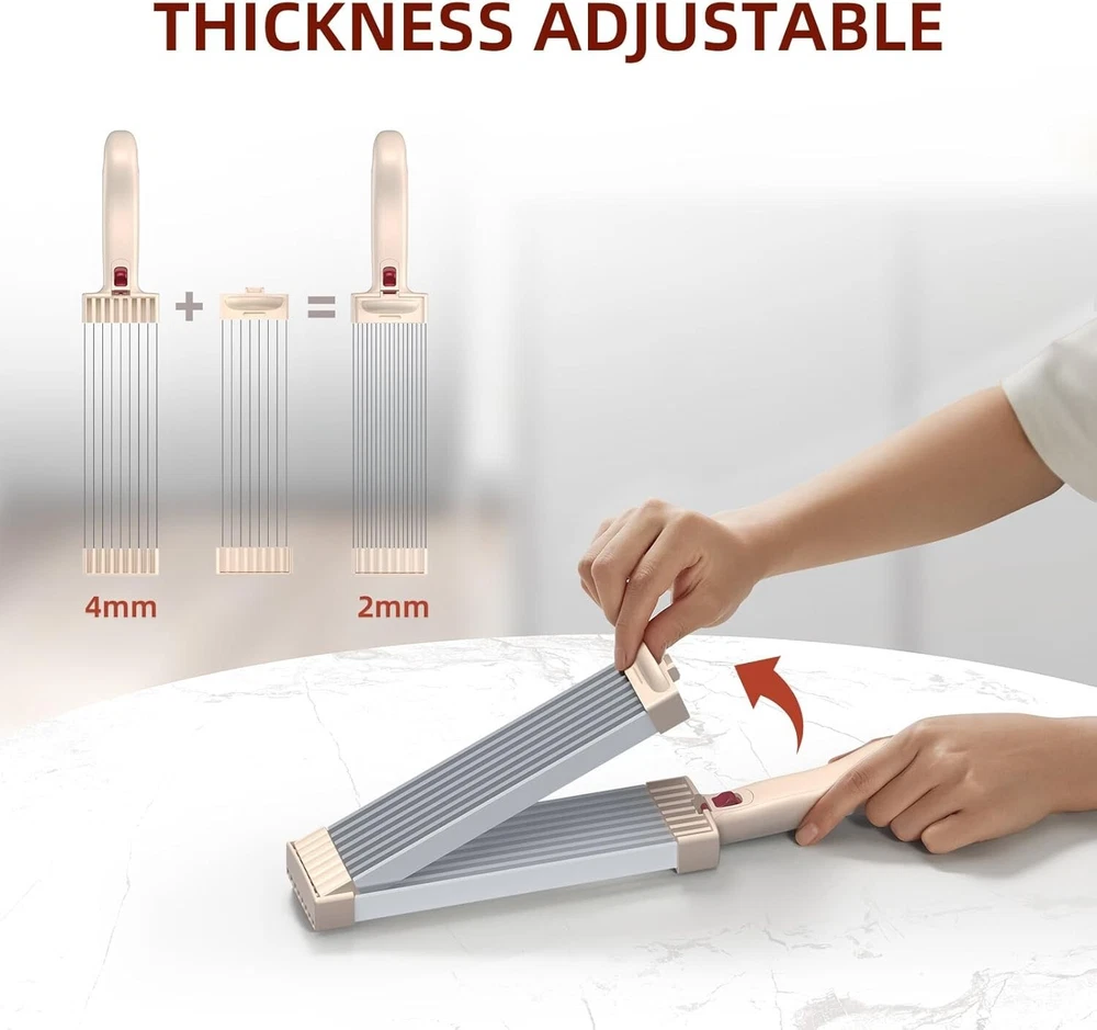 Blade Material Stainless Steel Brand ONCE FOR ALL Color Meat Slicer Pink Handle Material Polymer Compound Blade Edge double-edged About this item Freshness Matters - We Need Fresh Meat: As we all know, frozen meat will lose some of its nutrition and flavor. Compared with other meat slicers that cut frozen meat, the ONCE FOR ALL food slicer is able to cut fresh chicken breast, pork, beef, lamb, salmon, etc. Fresh meat can make better cuisine. Highly Efficient - One Cut 18 Slices: Up to 17 blades can be installed, easily cut a whole block of fresh meat into 18 thin slices in one stroke. By adjusting the direction of the meat, it can also be cut into different shapes such as shredded meat, cubed meat, and meat foam. Thickness Adjustable - 2 or 4 mm: This meat slicer cutter comes with 2 blade sets that are quickly installed and removed with the push of a button. You can easily slice 2mm or 4mm meat slices by switching between different numbers of blades, It's convenient for hot pot, BBQ, or stir-frying meat. Outstanding - This meat slicer is made of 420 stainless steel blades up to 6.7 inches (17 cm) . With an 8° sharp edge for a professional cooking experience. It also comes with a ring knife sharpener for quickly and effectively keeps your kitchen knives brilliantly sharp and restores blunt knives back to their former sharpness. Easy To Clean - Dishwasher Safe: Equipped with a special hard bristle brush, you can easily clean the blades and containers. The blade set, container and base are all removable designed, which make them easier, faster and less time consuming for cleaning. The base of the container has a large suction cup that holds it securely to a smooth tabletop. The slots of container are match the spacing of the knives, making it easy to slice a full piece of meat into slices by simply aligning it. No need to hold your hand on the meat or near the blade, unprecedented safety! Compact Design - Easy Storage: There is a sheath that makes it easy to store the slicer and prevent injury. A 3-in-1 rotatable sticky hook is included, you can hang the knife and accessories anywhere in your kitchen at once for convenience. Product information Blade Material Stainless Steel Brand ONCE FOR ALL Color Meat Slicer Pink Handle Material Polymer Compound Blade Edge double-edged Blade Length 21.5 Centimeters Construction Type Stamped Blade Color metal Is Dishwasher Safe Yes Item Length 6.7 Inches Manufacturer ONCE FOR ALL Size 8.5" Manufacture Year 2024 Item Weight 1.59 pounds ASIN B0DJQVLLFB Country of Origin China Item model number MS-2024-03