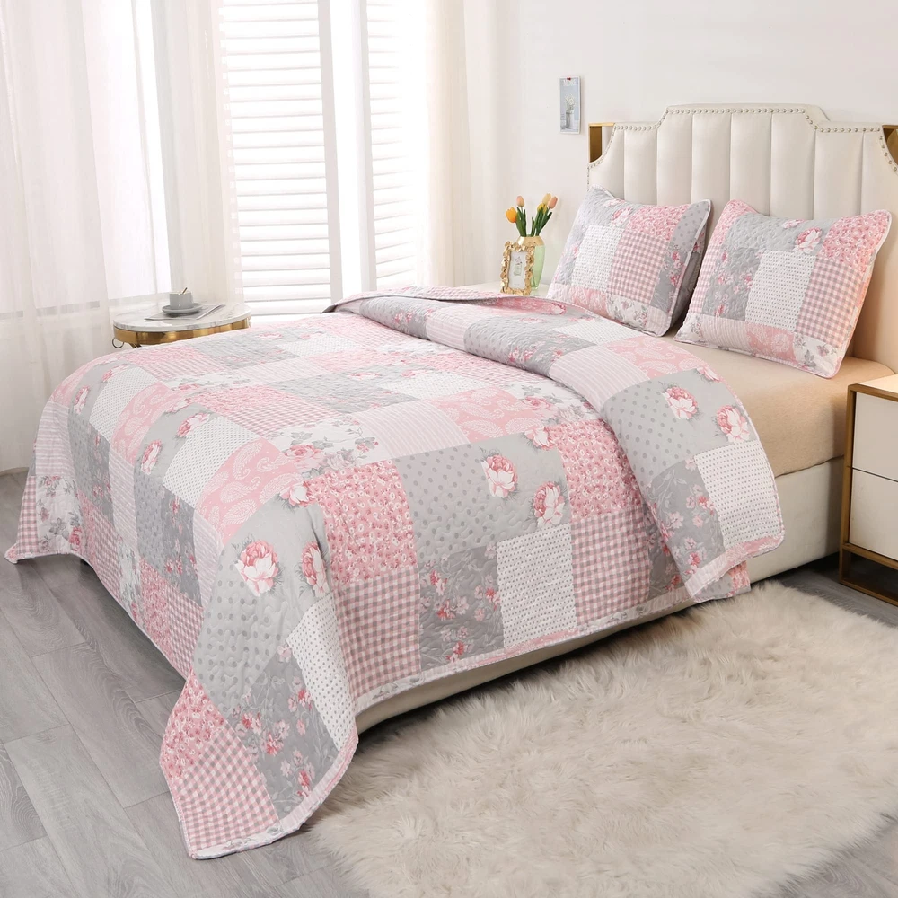 【Material】Shell:100% microfiber | Fill:100% microfiber. Using soft light fabric, comfortable and lightweight bedspread set, good choice for all year round. This quilt set is reversible, both sides could be used individually. Coverlet set Includes: 1 Bedspread + 2 Pillow Cases. 【Full/Queen Size】Quilt: 87" x 95", 2 Pillowcase: 20" x 28". It can be used as the quilt, bedspread and coverlet all season to keep warm, good choice for travel and gift.It can stand alone on your bed or act as a great layering piece creating a lively atmosphere for your room. 【Floral Patchwork Design】A combination of floral and paisley prints further embellish the vintage washed patchwork design making it more beautiful. Charming and elegant, the vintage washed patchwork quilt set makes a good centerpiece for your bedroom décor. 【Four Seasons & Functional Quilt】 It is can be directly covered as a quilt or blanket in Spring & Summer,also can be used as thick bed sheets / bedspreads in Autumn & Winter. Enjoy it in the bedroom, guest room, room, RV, vacation home,etc.. 【Easy Care】The quilted bedspread set which makes the stitching smooth, fine, and compact, which prevents it from falling apart over time and ensures it washes well. Machine wash, tumble-dry low or sun dry. No Chlorine bleach or any additives.