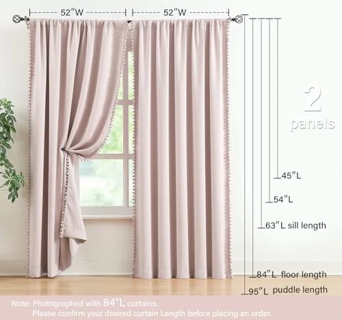 Pink Pom Pom Blackout Curtains for Girls Bedroom 63 Inch Energy Efficient Window Drapes