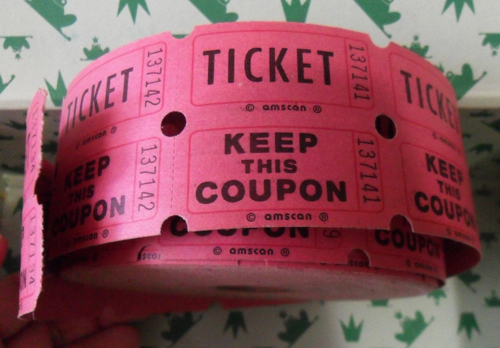 Here is a Pink / Red Double TICKET "Keep This Coupon" ROLL, Amscan, Almost Complete or 2000. A brand new Roll has 2000 tickets, but this one has been opened and started, so there are less than 2000 tickets. I don't know how many, because to know, I would have to unroll the whole thing, I can just give you the dimension of this roll: Size : 4 3/4" across the roll, each double ticket is 2" long and 2" wide. This Roll is rather heavy. I have no idea what are these tickets for, but I know that they used to be sold in party's stores. You can also use these tickets on collages, or scrapbooks, junk books, journals... In Art, more generally... Condition : The roll has been opened and started so the roll is not quite complete, but still rather big. One side of the roll is slightly dusty on one side, on the edges of the tickets (please, check the last photo), but once detached from the roll, it is absolutely not visible on the tickets. Overall great used condition! Please, check the photos as well.