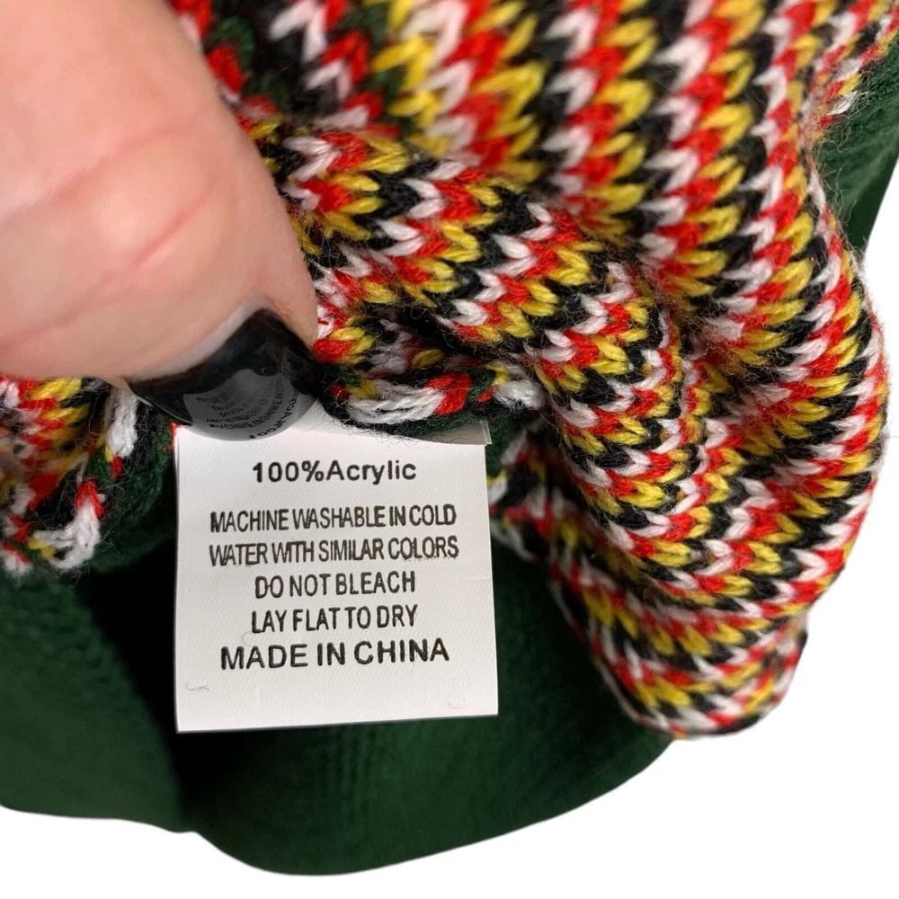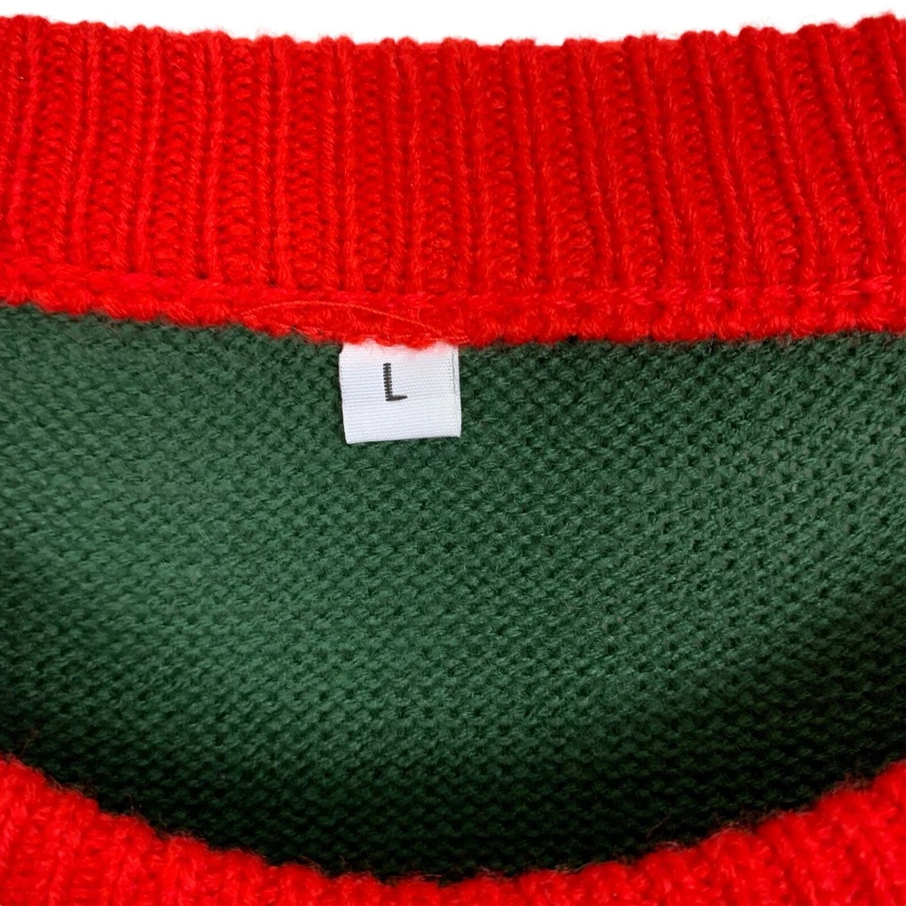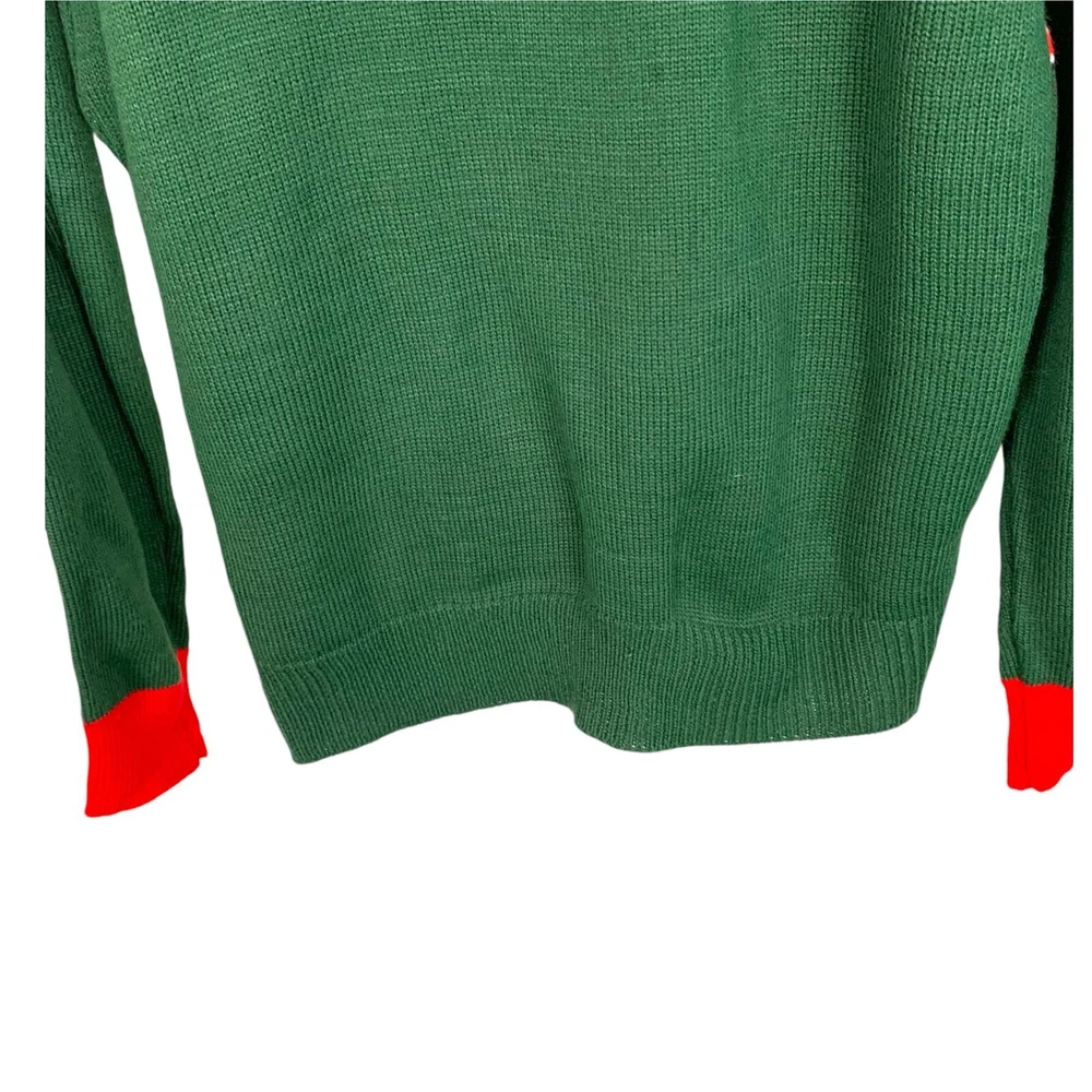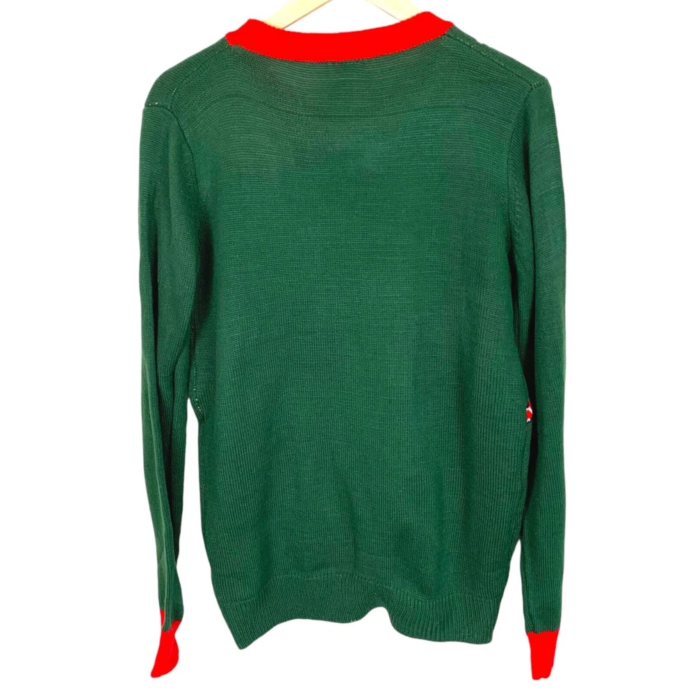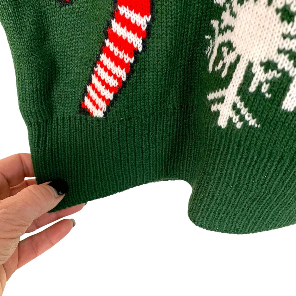 Pink Reindeer Size Large Green Knit Sweater Red Collar & Cuffs With Candy Canes, Bells and Snowflakes Holiday "Ugly" Sweater It is difficult to call this an "Ugly Sweater" as the Reindeer 3 D applique with a red scarf is so cute!! The sweater is in EXCELLENT Pre-Owned Condition - with NO FLAWS - please see all pictures Ribbed Collar, Cuffs, and Hem Line This sweater can be worn for all of your fun holiday parties - you will get so many compliments - as it's unique and combines all of the fun holiday symbols in a very creative way Measurements (flat lay) Chest (pit to pit): 21.5" Sleeve (shoulder to hem of cuff): 28.5" (the Red portion is 2.75") Length (shoulder to hem of sweater): 28.5" Materials: 100% Acrylic Care: Machine Wash FAST SHIPPING Smoke Free Home Please reach out with any questions - I am always happy to answer!!