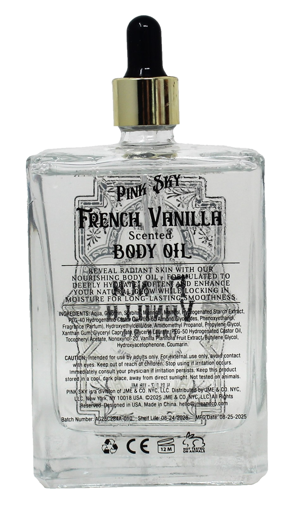 <div style="text-align:center"><img src="http://ti2.auctiva.com/sw/java.gif" border="0"><br><table align="center"><tr><td><a style="text-decoration:none" href="http://emporium.auctiva.com/Dimpl28" target="_blank"><img src="http://ti2.auctiva.com/sw/browse2.gif" border="0"></a></td><td height="21px" valign="middle" align="center"><font face="arial" size="2"><b><a href="http://emporium.auctiva.com/Dimpl28" target="_blank">Dimpl28</a> Store</b></font></td></tr></table></div> <img src="http://ti2.auctiva.com/web/aswCredit.gif" border="0"><br><a href="http://www.auctiva.com/?how=scLnk0" target="_blank"><img src="http://ti2.auctiva.com/images/sc1line0.gif" border="0"></a> Pink Sky French Vanilla Oil Body Scented Glass Bottle 4 oz Brand New We have been selling on eBay since 2002 and have always had a good standing with eBay due to our integrity. All our products are 100% authentic. To sell anything other than that is illegal and immoral. We do not ship internationally unless it's to a military address, in which case, we are honored to do so. All orders are double checked before shipping out to avoid any mistakes. We are honest and upfront about items and the condition of items. Once an item is purchased, the address cannot be changed nor can the order be canceled. Our handling time is 2 days, unless we’re out of town and then it will be changed to reflect any delay. Our customers make this business possible and I truly appreciate each & every one of you! Thank you!