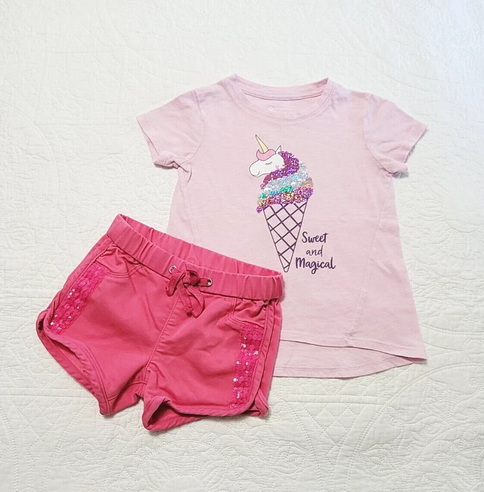 BRAND: Members Mark Pink Unicorn/Cone top and shorts COLOR: Pink CONDITION: Good Preowned Condition- no visible stains or rips SIZE: Girls 4/5 SHIPPING: Items will be shipped to eBay confirmed address only unless otherwise instructed. Items will be shipped within one business day after payment has cleared. Shipped with USPS. RETURNS: Returns are accepted within 30 days (Unless noted otherwise). Buyer pays for return shipping. COMES FROM A SMOKE FREE HOME. Please don't forget to check out my other items!!! THANK YOU! Your business is much appreciated!!!