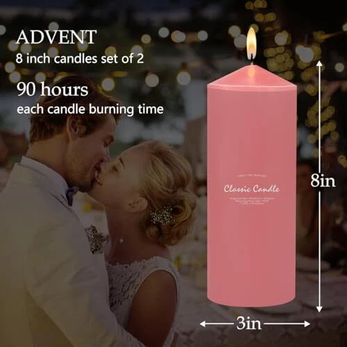 Special Feature: Long Burning, Clean Burn, Smokeless, Slow Burning, Dripless UPC: Does Not Apply Model Name: Pillar Candles Package Information: Can Theme: Romantic EAN: Does Not Apply Item Diameter: 3 Inches Batteries Required: No Occasion: Valentine's Day gtin13: Does Not Apply Wick Quantity: 1 Indoor Outdoor Usage: Indoor Type: Does Not Apply Manufacturer: Does Not Apply Are Batteries Included: No Color: Pink Item model number: Pillar Candles Brand: Does Not Apply Material: Wax Product Dimensions: 3"W x 8"H Unit Count: 2.0 Count Candle Type: Pillar Candle Specific Uses For Product: Pillar Candles Item Width: 1 Scent: Unscented Date First Available: December 9, 2023 Shape: Round Seasons: All Season Batteries Included: No Material Feature: non-toxic Item Length: 1 Item Height: 1 Style: Classic Special Features: Long Burning, Clean Burn, Smokeless, Slow Burning, Dripless Part Number: Pillar Candles Item Weight: 1.6 Pounds Number of Items: 2 MPN: Does Not Apply