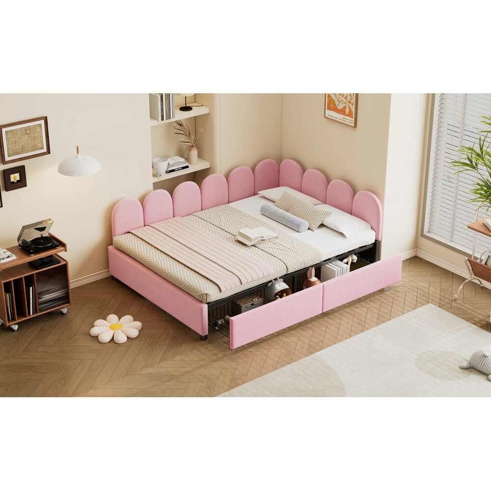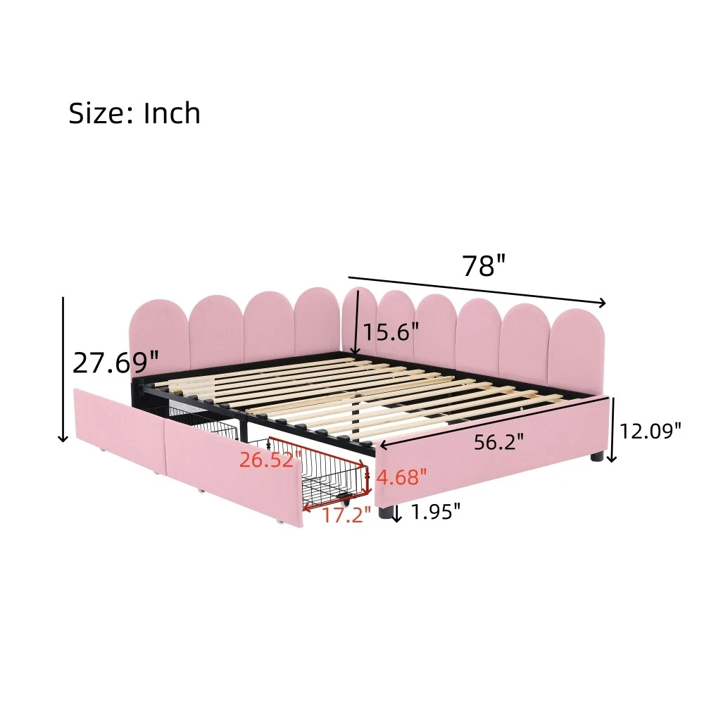 Comfortable Fabric: This upholstered daybed is made of selected velvet, soft fabric headboard provides a comfortable and warm sleeping environment. Elegant Design: This daybed is not only suitable for any home decoration, but also loved by children.The diagonal design of the headboard allows this bed to be placed in a corner, saving space and making it more comfortable. 2 Large Drawers: This daybed has 2 drawers for storing clothes, books, toys, etc. It is very practical and makes full use of the space. Solid Construction: Made of high-quality MDF, the frame of this bed is not easy to be affected by humidity change and lead to crack. The strong legs, wide boards and 12 slats for bed, not only improve the weight capacity of the bed greatly but also ensure the stability. Dimensions and Assembly: Overall Product Dimension: 78"L X56.2"W X 27.69"H. Suitable for full size mattresses. Full size Upholstered Daybed with 2 Drawers, Velvet Sofabed with Soft Fabric Headboard, Rose Red This daybed is made of selected velvet, elegant white,rose red or pink, with tufted shape headboard, elegant and cute, not only suitable for any home decoration, but also loved by children. A soft fabric headboard provides a comfortable and warm sleeping environment. This daybed is a valuable choice as it does not require a box spring or foundation. Just place your mattress on top and enjoy it. With our daybed, relaxation meets efficiency, making it the perfect addition to any modern home.