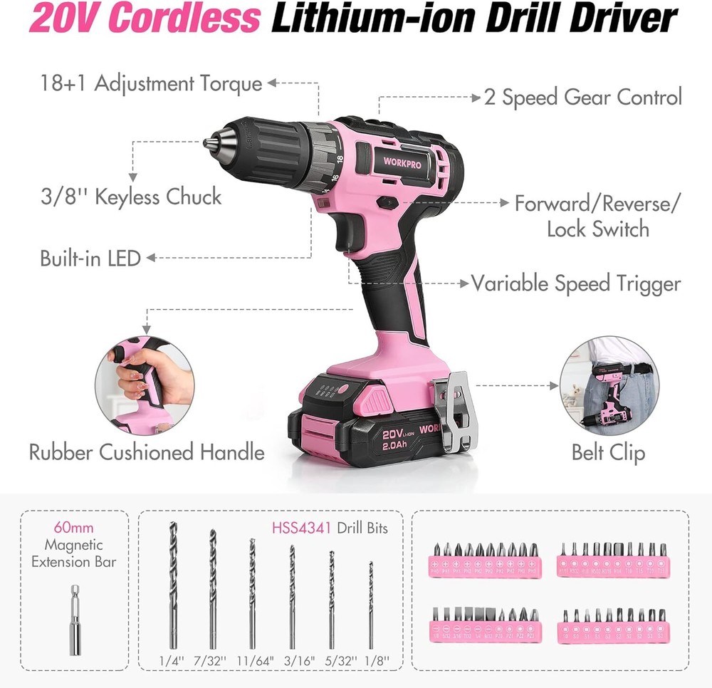 WORKPRO Pink Household Tool Kit with Drill, 157PCS Set 20V Product Details Maximum Rotational Speed: 1300 RPM Unit Count: 1.0 Count Manufacturer: Hang Zhou Great Star Industrial Co.,LTD Item Weight: 13.24 pounds Product Dimensions: 14.37 x 11.42 x 7.68 inches Item model number: W009152 Batteries: 1 Lithium Ion batteries required. (included) Color: Pink Power Source: Battery Powered Special Features: Variable Speed Batteries Included?: Yes Batteries Required?: Yes Battery Capacity: 2 Amp Hours Brand: WORKPRO Voltage: 20 Volts Battery Cell Composition: Lithium Ion Number of Batteries: 1 Lithium Ion batteries required. (included) Included Components: Hand Tools and Drilling Accessories, 20V Cordless Power Drill with Fast Charger, Storage Bag MAKE SURE battery has some charge, ideally 50 to 60 percent, before putting it away. Due to Low voltage protection mechanism of lithium battery, to recharge the battery after it completely drains, you may need to wait for 4-5 minutes until your charge senses a battery and then it should begin to charge normally. If you have any questions, please feel free to contact our team From January 1, 2024 to December 31, 2024, your purchase of this product will result in a minimum donation of $15,000 to be donated to Helping Women Now MORE PRACTICAL THAN IT LOOKS, quality home drill kit constructed from high strength heat treated CRV, corrosion and rust resistant finished where needed for durability and extended tool life PINK DRILL DRIVER, tool set with drill equipped with 2-speed, 19 torque settings gives enough variability for wide applications. Ideal drill kit for home maintenance and garage repairs CLASSIC ALL-ROUND PINK TOOL KIT, the most useful and necessary tools for home daily use including drill driver, bits, hammer, adjustable wrench and other basic hand pink tools, for both man and ladies ALL IN ONE TOOL BAG, great tool set for home. It comes with a handy tool bag that stores everything neatly. Wide mouth open makes you find tools easily PLEASE NOTE: Sparks relatively contained inside the drill, are completely normal and occurs when your drill is running at any speed. However, if there are intermittent and violent sparks around the motor, power cord, or battery compartment, this is sign of an issue that must be repaired. Although sparking is part of normal operation, they have the potential to ignite debris in the air such as sawdust. It's even possible to ignite gas, so ensure that your work area is well-ventilated