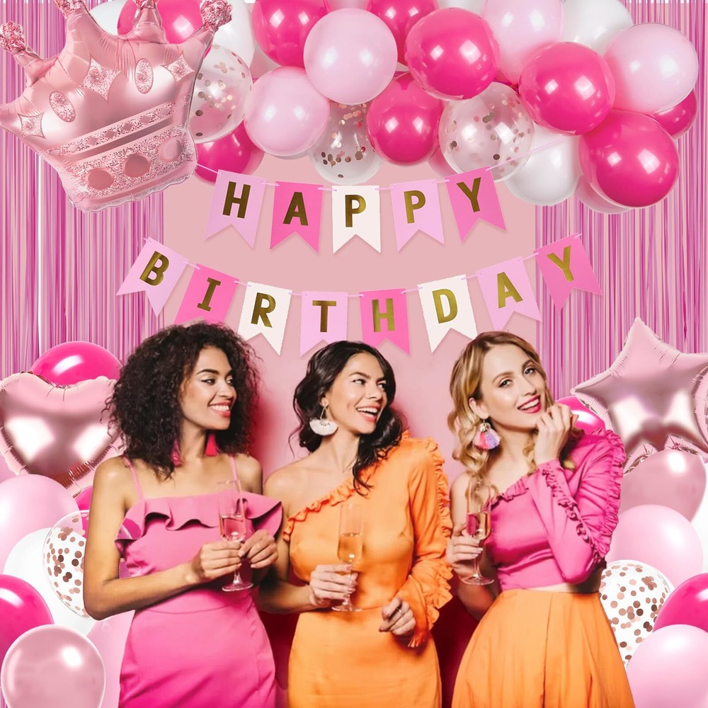 Package Included: The pink happy birthday decorations kit include 10inch hot pink balloons x15, 10inch light pink balloons x10, 10inch white balloons x10, 10inch metallic rose gold balloons x5, 12inch rose gold confetti balloons x3, hot pink happy birthday banner x1, foil balloon x3, hot pink fringe curtains x1, glue dots x60, pink ribbon x1 Full Birthday Decoration Set: The all-inclusive hot pink party decorations set includes a Happy Birthday banner, fringe curtains, and balloons. Great for creating a backdrop or photo booth for celebrations Easy to Use: The pink birthday party decorations bring charm to your party, creating unforgettable memories. The hot pink birthday decorations for women includes glue dots and ribbons for easy balloon arch setup. Hang banners and balloons on walls, windows, or any indoor or outdoor space you like Suitable Occasion: The pink happy birthday decorations kit is great for many happy birthday decorations, that include pink birthday decorations for adults and women, can be used as 16th, 18th, 21st, 25th, 30th, 40th, 50th, 60th, 70th birthday party decorations Warm Tips: If there are any issue with the women birthday decorations set, we will work hard to solve them until you are satisfied