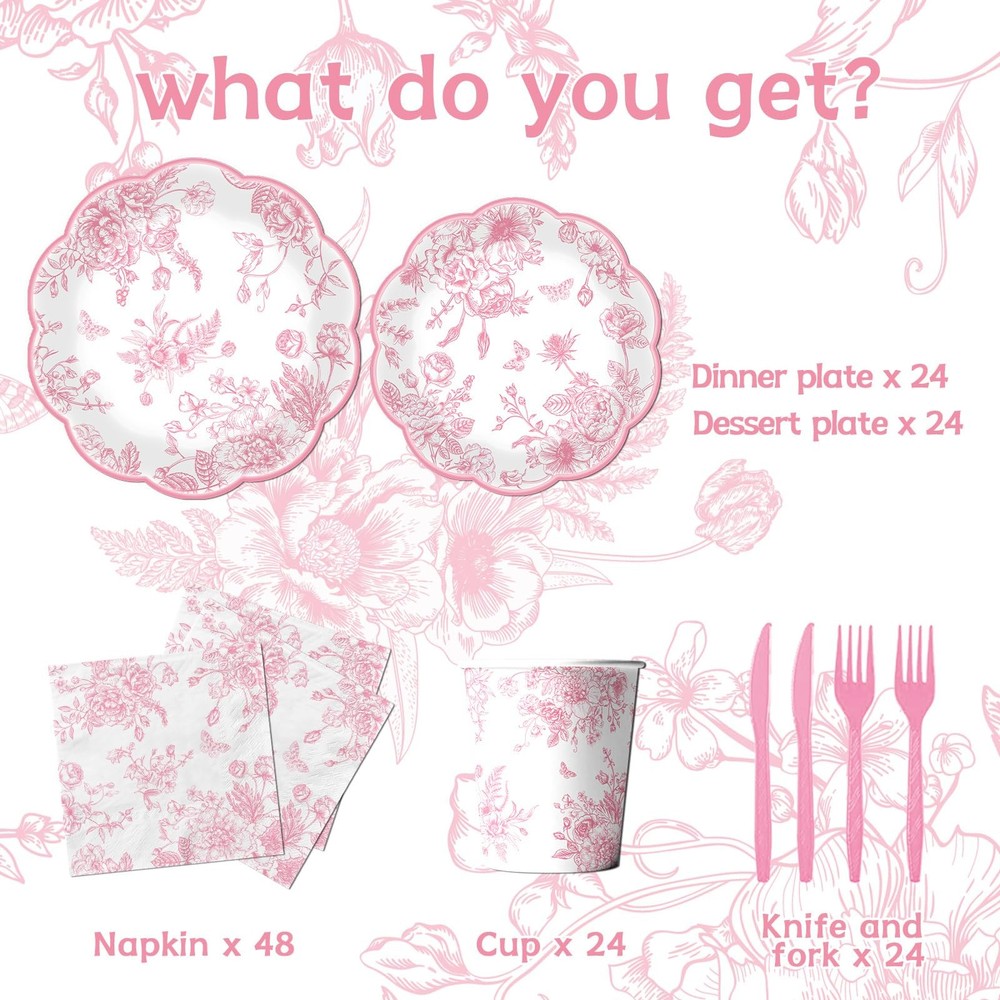 Pink floral Paper Plates, 144Pcs Toile Scalloped Paper Plates and Napkins includes Floral Paper Plate and Flower Napkins, Vintage Pink Floral Plate for Wedding Bridal Tea Party Supplies package includes: you will receive 124pcs pink floral dinnerware set includes 24pcs 9-inch scalloped pink floral plates, 24pcs 7-inch flower paper plates, 24pcs pink floral napkins, 24pcs pink knifves and fork each set can serve 24 guests. the vintage toile plates are ideal for creating a celebratory atmosphere and making your event memorable. this set of flower disposable plates and pink toile napkins set will add amazing to you, your family and friends premium material: all of our pink tea plates and floral napkins sets like pink floral paper napkins and pink flower paper plates are made of quality paper, and the thickened can withstand normal food weight. beautiful colors and reliable quality will make you enjoy the decorating process and celebrate your wedding bridal tea party. make a splash at your pink toile scalloped paper plates with our delightful floral dessert plates disposable and napkins save time: no wash-up! the disposable pink floral plates and pink flower napkins set can save you from the hassle of cleaning after the party, you just need to throw wildflower plates and napkins sets into the trash can after the bridal shower decorations. beautiful colors and reliable quality will make you enjoy the decorating process and celebrate bridal tea spring party. make a splash at your pink floral party with our delightful tableware unique : floral paper plates party supplies with classic images, the blue floral tableware set are designed with pink flower tolie patterns. making your party full of the joyful atmosphere, add a touch of cute and freshness to your party. if you want to have a creative party, then you must not miss this set of floral disposable plates. this set of pink floral plates disposable can be a great experience for your family and their friends multi-purpose:pink vintage floral party plates and napkins for baby showers, pink bridal shower decorations, pink bridal party decorations, wildflower party decorations, spring party, tea party and pink floral party decorations . making it a memorable moment for your friends, you and your family Pink Floral Toile Scalloped Paper Plates and Napkins: floral paper plates party supplies with classic images, the blue floral tableware set are designed with pink flower tolie patterns. making your party full of the joyful atmosphere, add a touch of cute and freshness to your party. if you want to have a creative party, then you must not miss this set of floral disposable plates. this set of pink floral plates disposable can be a great experience for your family and their friends beautiful colors and reliable quality will make you enjoy the decorating process and celebrate bridal tea spring party. make a splash at your pink floral party with our delightful tableware. Package Content: 1 pcs xmarch basketball banner; 20 pcs x pink floral plastic forks; 20 pcs x pink plastic knives; 20 pcs x 9''pink toile paper plates; 20 pcs x 7'' floral birthday plates; 20 pcs x pink flower napkins; floral paper plates|floral plates|floral plates disposable; floral disposable plates|pink floral paper plates|wildflower disposable plates; floral paper plates party supplies|pink toile scalloped paper plates|pink flower plates; Shipping We offer FREE shipping on all orders! We ship within Three business days of payment, usually sooner. We use a selection of shipping services such as UPS, FedEx, USPS etc. We only ship to the lower 48 states, no APO/FPO addresses or PO Boxes allowed. Local pickups and combined shipping options are not provided at this time. Return You can return a product for up to 30 days from the date you purchased it. Any product you return must be in the same condition you received it and in the original packaging. Please keep the receipt. Payment We accept payment by any of the following methods: PayPal Please pay as soon as possible after winning an auction, as that will allow us to post your item to you sooner! Feedback Customer satisfaction is very important to us. If you have any problem with your order, please contact us and we will do our best to make you satisfied. Contact Us If you have any queries, please contact us via ebay. We usually respond within 24 hours on weekdays. Please visit our eBay store to check out other items for sale! Thank you for shopping at our store.