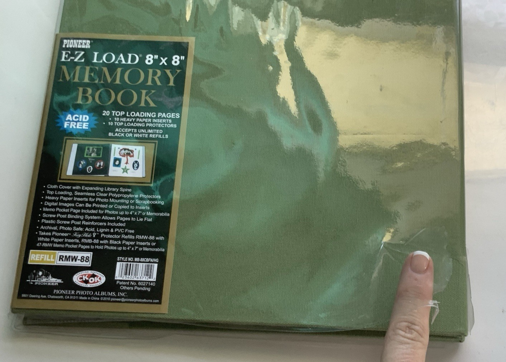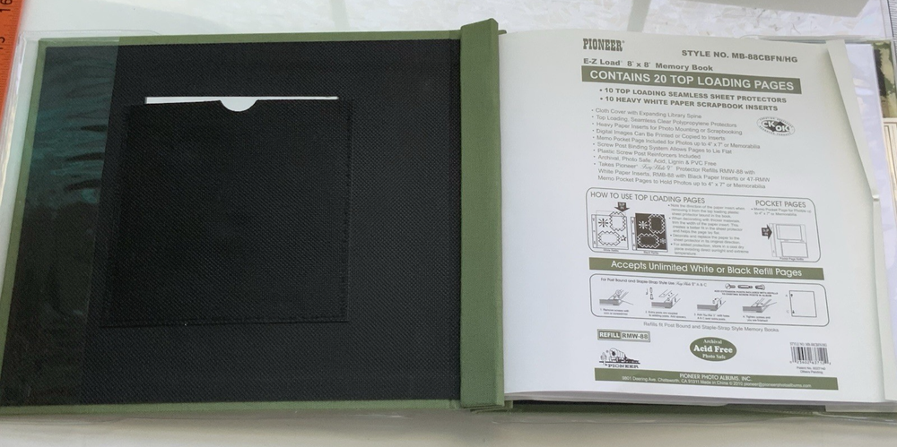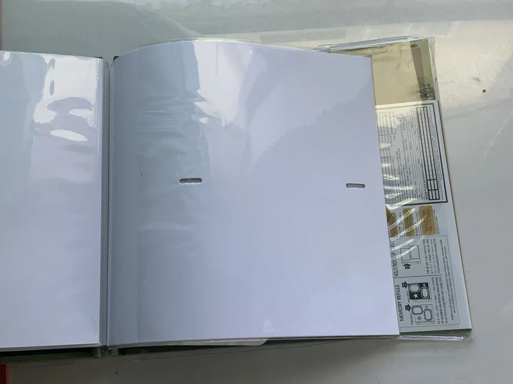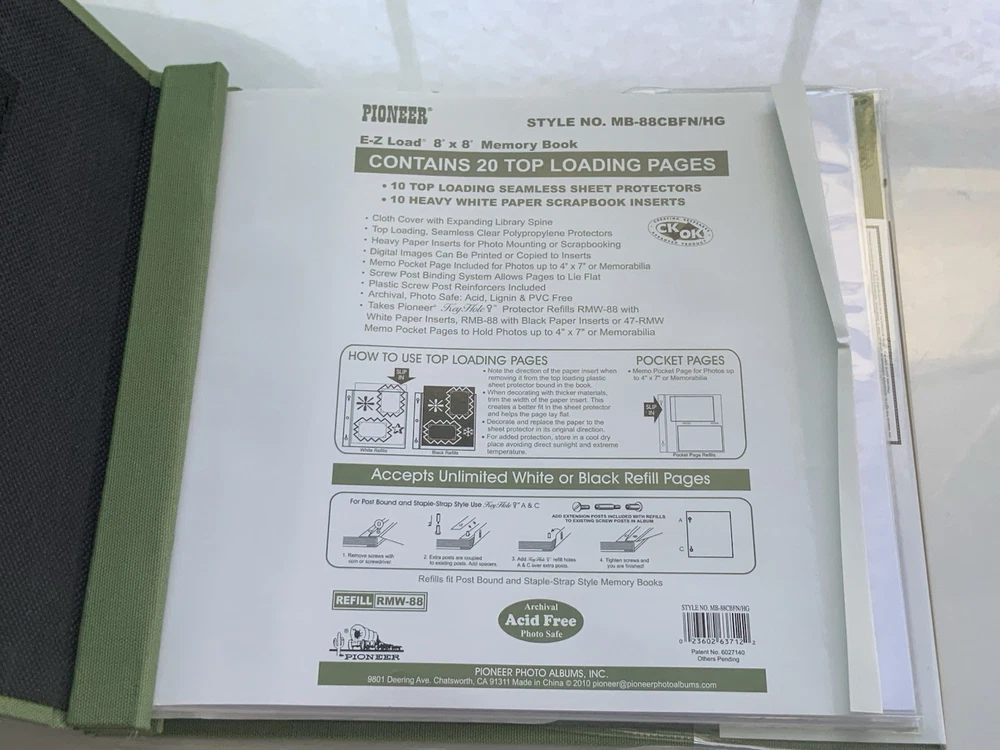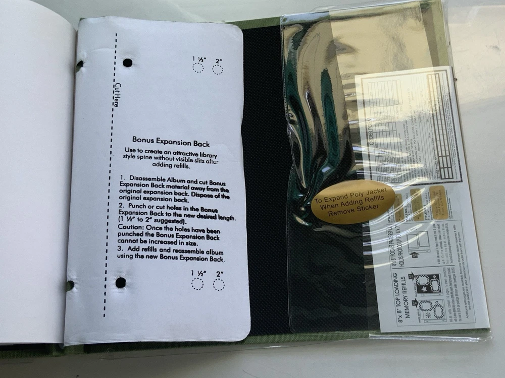 Unused but clear cover jacket is ripped on back and index page is bent on edge. Please see photos for exact condition. Includes a bonus 4x7 pocket page in back Spine adjusts so that the green binding covers adding additional inserts (not included) post bound Used Pioneer Key Hole Protector Refills RMW-88 or RMB-88 or 47-RMW