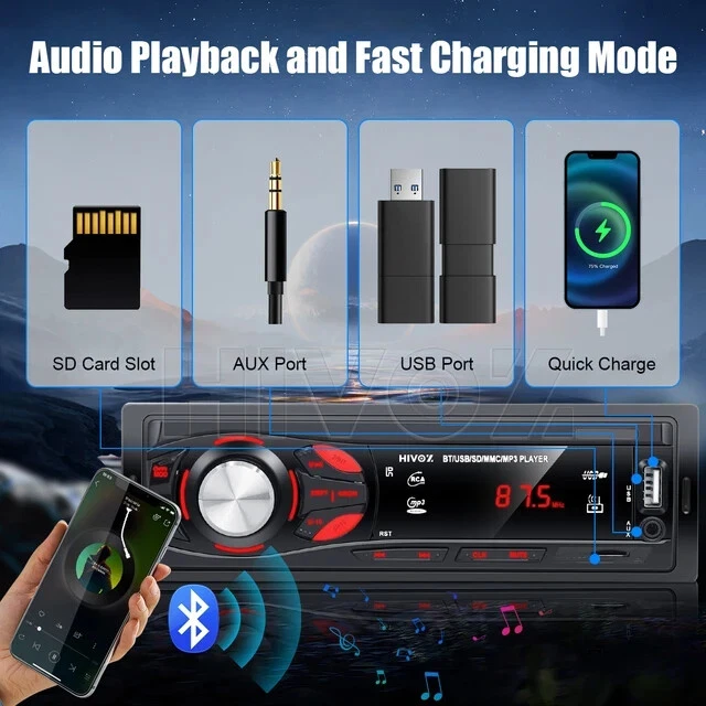 Bluetooth Stereo : The HIVOZ car radio audio features Bluetooth stereo, allowing you to stream your favorite tunes wirelessly from your device for a seamless audio experience. • Hands-Free Calling : Equipped with hands-free calling capability, this car radio enables safe and convenient calling while on the go. • MP3 Player : This compact car radio also doubles as an MP3 player, allowing you to enjoy your favorite tunes right from the comfort of your car. • FM Receiver : The built-in FM receiver ensures you can stay connected to your favorite radio stations, providing entertainment and information on the go. • AUX/USB/TF Card Slot : With AUX/USB/TF card slots, this car radio allows for easy expansion and versatility, supporting various media formats and storage devices. • In-Dash Placement : Designed for in-dash placement, this car radio sits neatly in your car's dashboard, offering easy access and a clean aesthetic. Note: This machine is a 12V machine, please make sure not to connect it to 24V power supply. Specifications: 12V machine: 12 - 14.4V Red fuse: 1A Yellow: 15A Special function: FM radio, Bluetooth, hands-free calling, MP3 player, USB flash disk Output power: 4 x 15W Voltage: 12V FM tuning range: 87.5 - 108.0 MHz Features Stable Built-in Bluetooth: Car Stereo Radio with built-in bluetooth, connected to your phone via bluetooth, you can listen to music, FM, answer/call hands-free and make driving safer. FM stereo: The Auto Stereo Car FM Player (87.5 - 108 mhz) can store 18 radio stations for fully automatic, semi-automatic and precise channel searches. Through it you can listen to music, traffic information, etc., you can receive information at any time and anywhere. Signal is smooth and sound is clear. Multiple connection methods: Car Stereo Bluetooth Player supports a large number of USB/SD storage devices. Supports AUX audio input, FM radio, USB interface, U disk playback, Bluetooth and TF card. Rear microphone input, subwoofer output. USB fast charging: The Pioneer Car Stereo offers 2.1A intelligent fast charging, 50% faster than other products, providing a fast and safe charging environment. Memory function: The Pioneer Car Stereo has a powerful break memory playback function, which prevents the music from restarting every time you turn on the player. Its clock function makes it easy for drivers to check the time. Package Included 1x car radio 1x remote control 1x power cord 1x speaker cable 1x manual