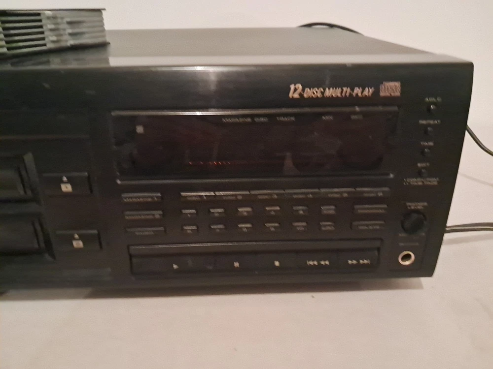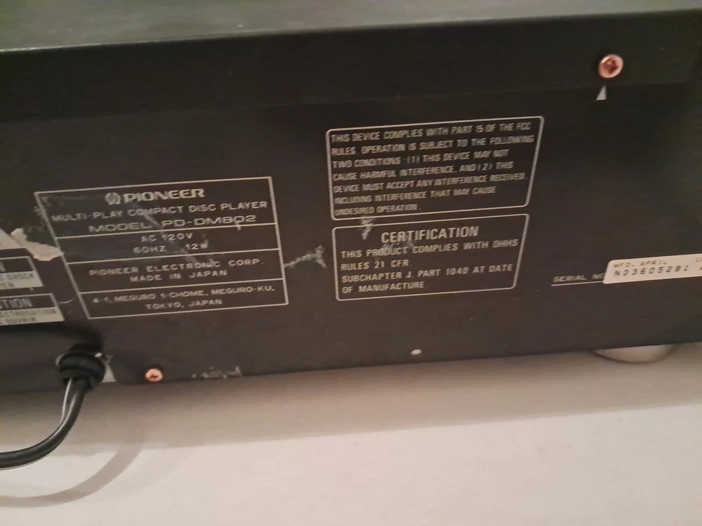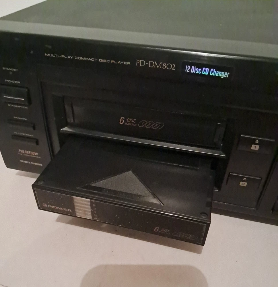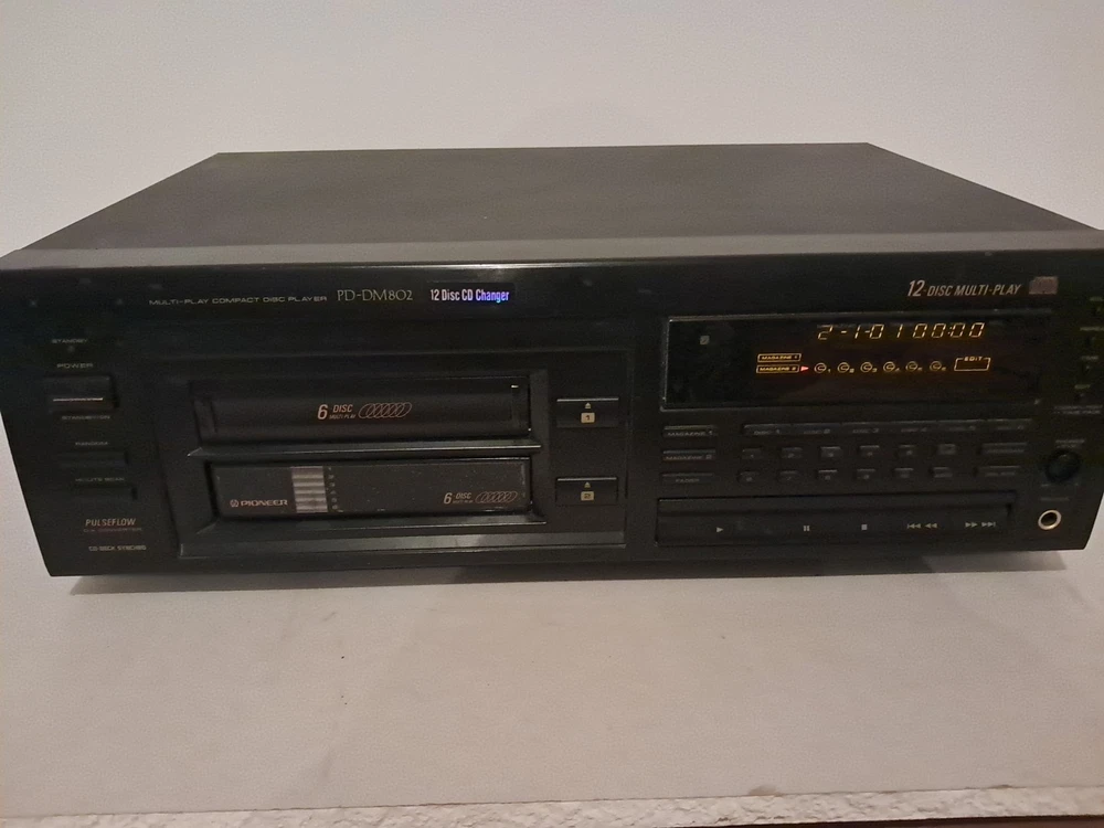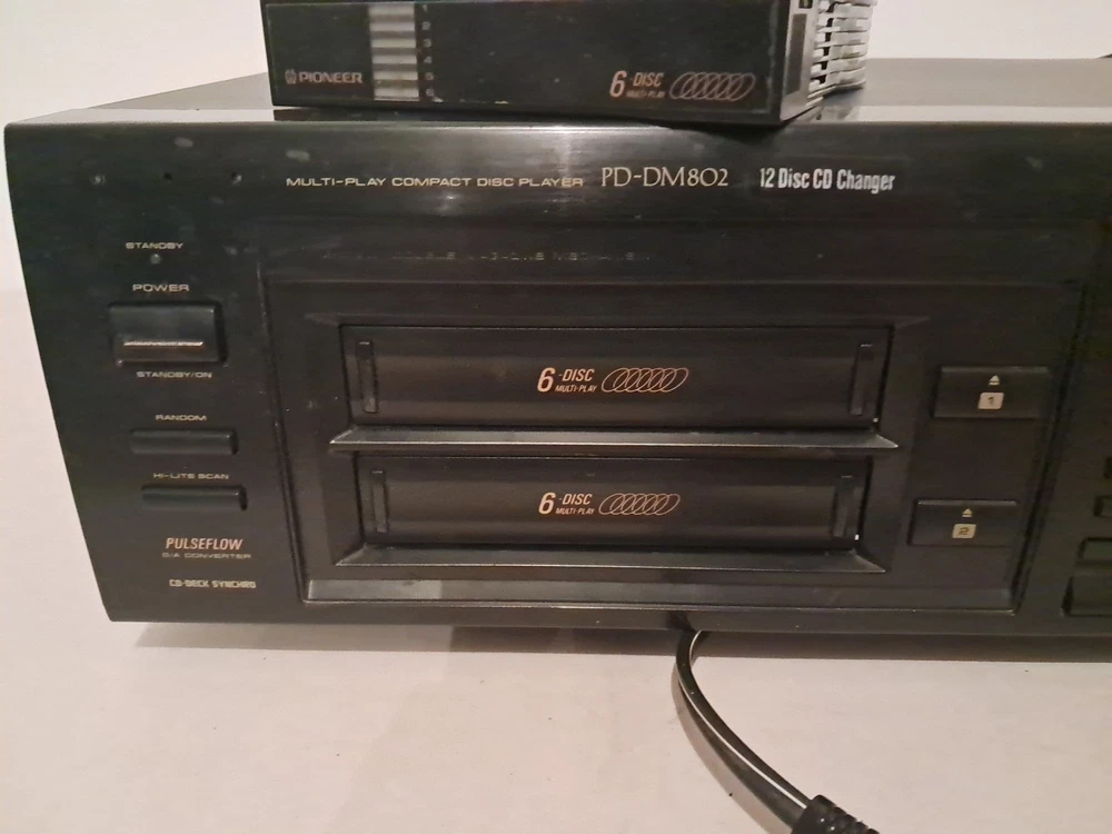 Pioneer PD-DM802 Vintage 12 Disc Multi-Play CD Changer - Partially Tested - Read This item is in good used cosmetic condition. It has been tested to turn on. This item has not been tested with speakers. However, a cartridge was inserted into both decks. The bottom deck ejected perfectly. However, the top deck only released the lock when the eject button was pressed. A thin piece of metal was used to pull the cartridge out manually. If you have any questions, please let me know, and I'll do my best to answer them. Please see all images before purchase. Thanks!