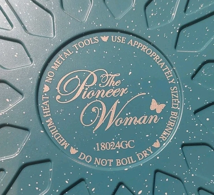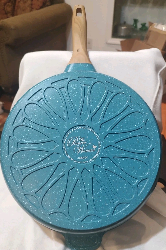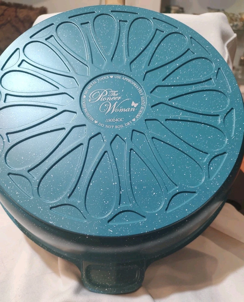 MPN:Prairie Signaturegtin13:Does not applyShape:RoundItem Depth:11.5 inItem Width:11.5 inCalifornia Prop 65 Warning:*******Item Height:2.75 inHeat Resistance:400°FFeatures:Dishwasher Safe, Easy Clean, Flat-Bottomed, With LidType:Saute PanManufacturer Color:Charcoal SpeckleCapacity:4 qtType of Oven:Electric, GasSurface Coating:Non-StickCountry/Region of Manufacture:ChinaItem Diameter:11.5 inBrand:Pioneer WomanManufacturer Warranty:NoNumber of Items in Set:2Set Includes:LidUPC:Does not applyColor:TealMaterial:Cast AluminumStove Type Compatibility:Electric, Gas