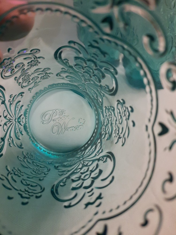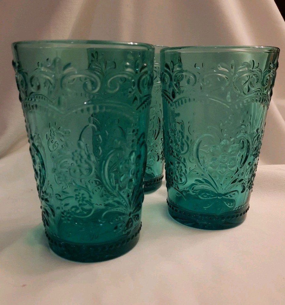This set of 3 Pioneer Woman Amelia Glass Tumblers in Teal is perfect for any farmhouse-inspired kitchen or dining area. The round, 16oz tumblers feature a beautiful blue color and are made of glass, making them ideal for all occasions. Each tumbler stands at 5.25" tall and has a 3 3/8" diameter, providing ample space for your favorite beverages. The set includes three tumblers, making it convenient for serving drinks to a small group of guests. Made in China, these drinking glasses are a stylish addition to your home.