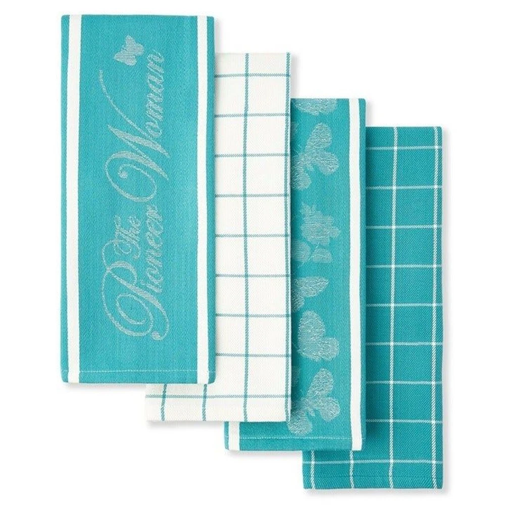 This set of 4 coordinating kitchen towels will add style and function to your farmhouse kitchen decor. Each towel features a different design in the matching colors of teal and white. A mixture of The Pioneer Woman logo, butterflies, grid, and stripe patterns complete this set of kitchen towels. These towels are sturdy enough to dry dishes and handle everyday messes yet pretty enough to display with your kitchen décor. The Pioneer Woman Butterfly Kitchen Towels are made of 100% cotton, making them machine washable for ease care. Each towel measures 16"W x 28"L. We stand behind all our merchandise. Shelf O-3