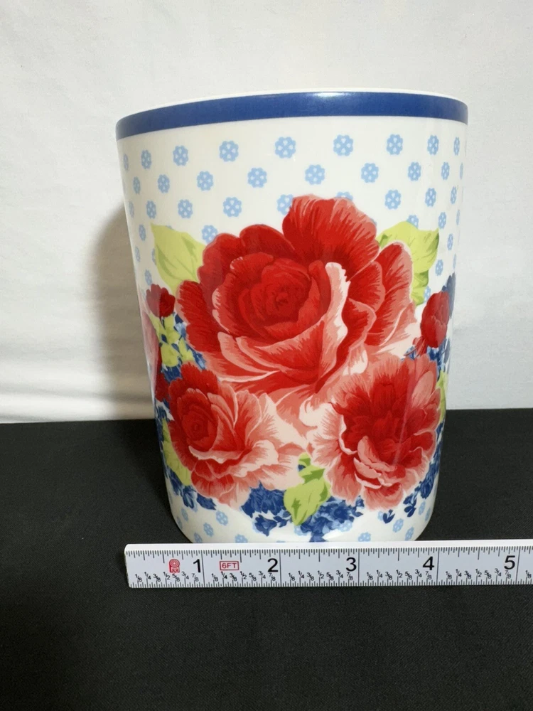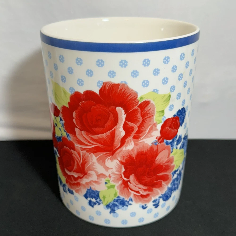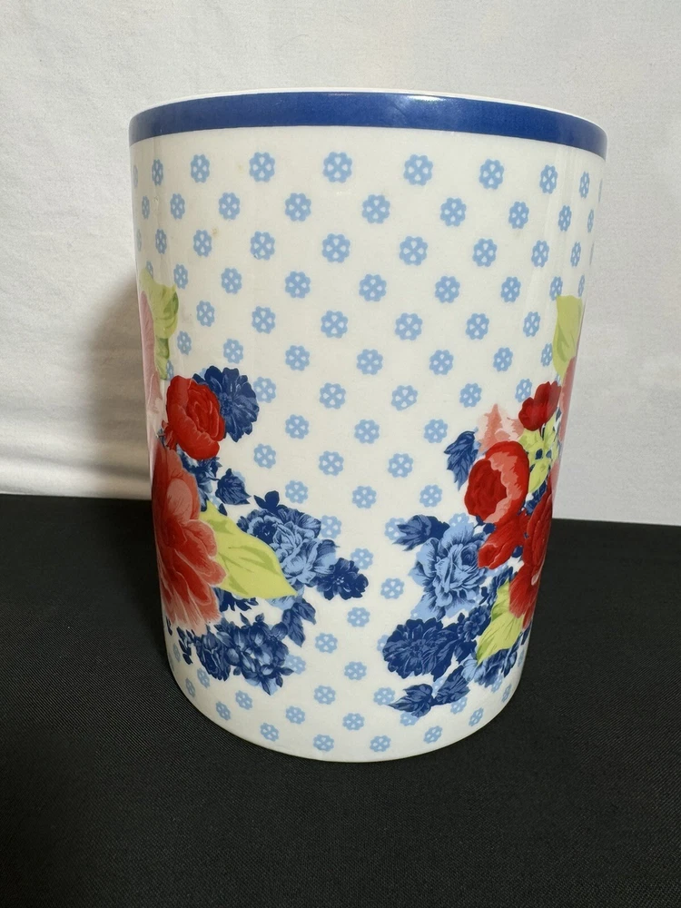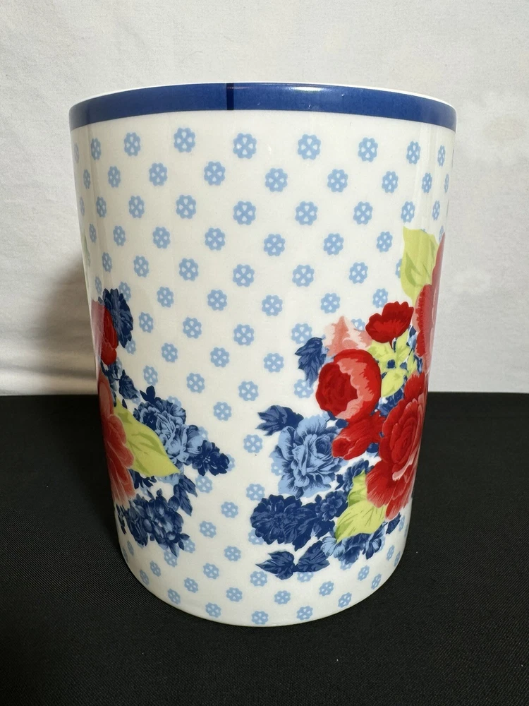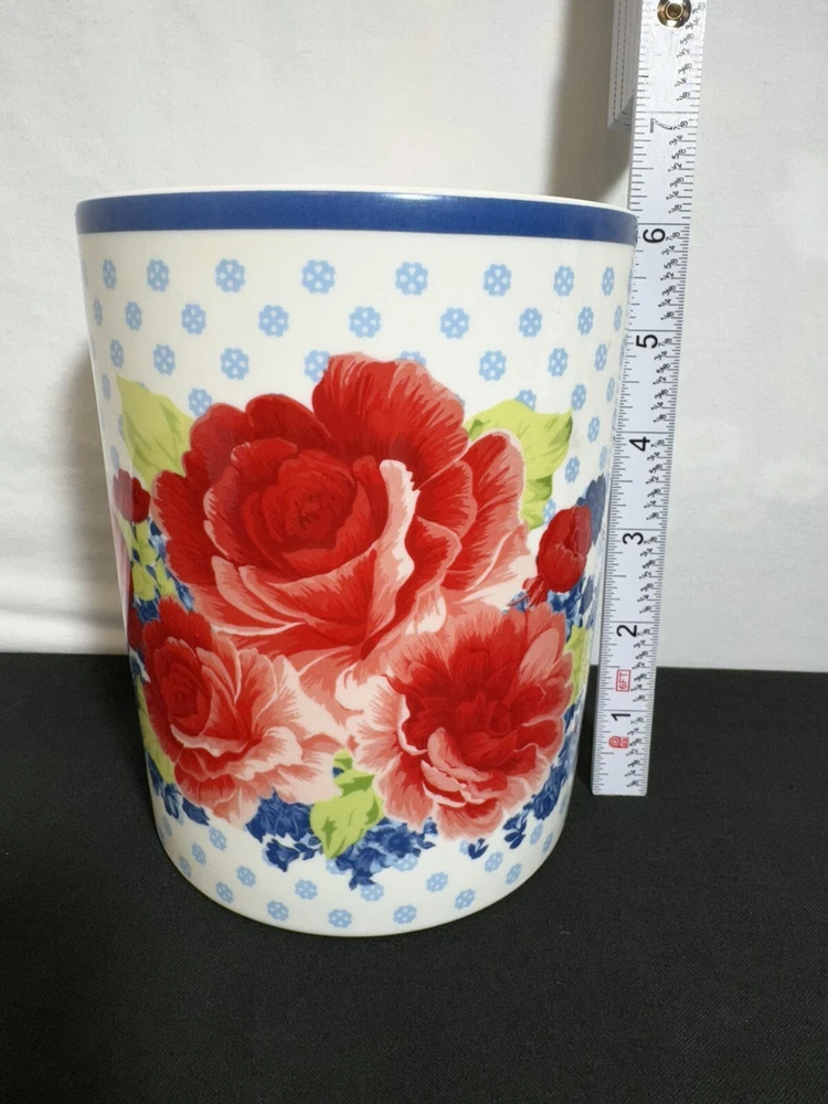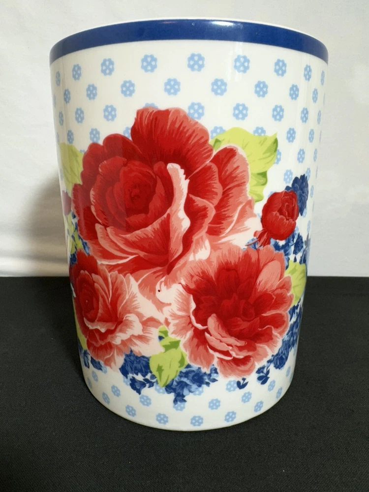 Pioneer Woman Ceramic Kitchen Utensil Holder Crock Red Blue Floral Polka Dots 6”