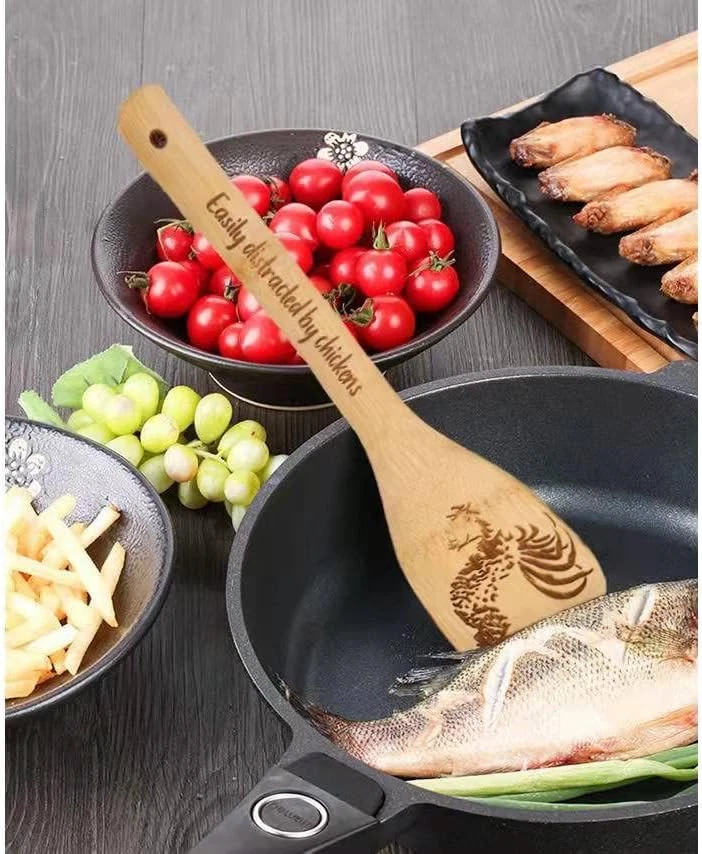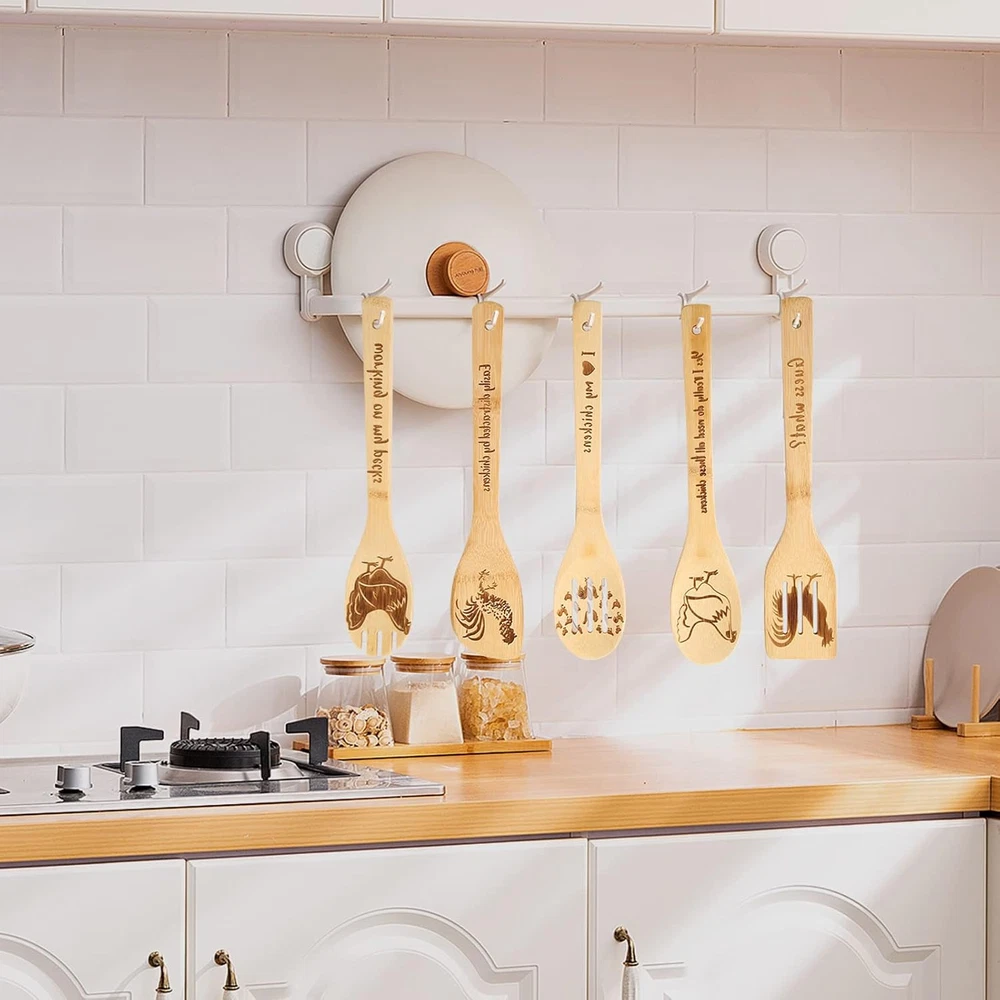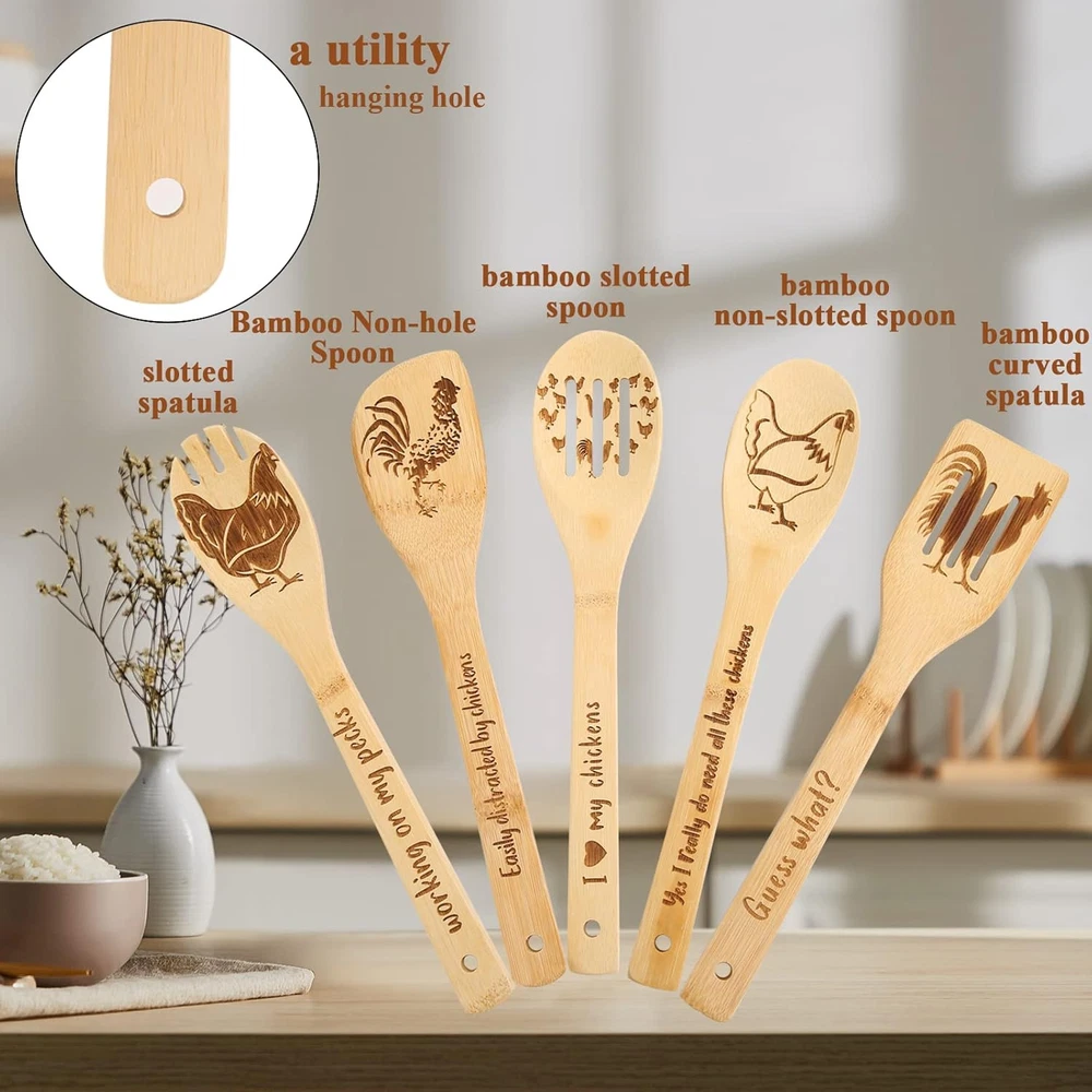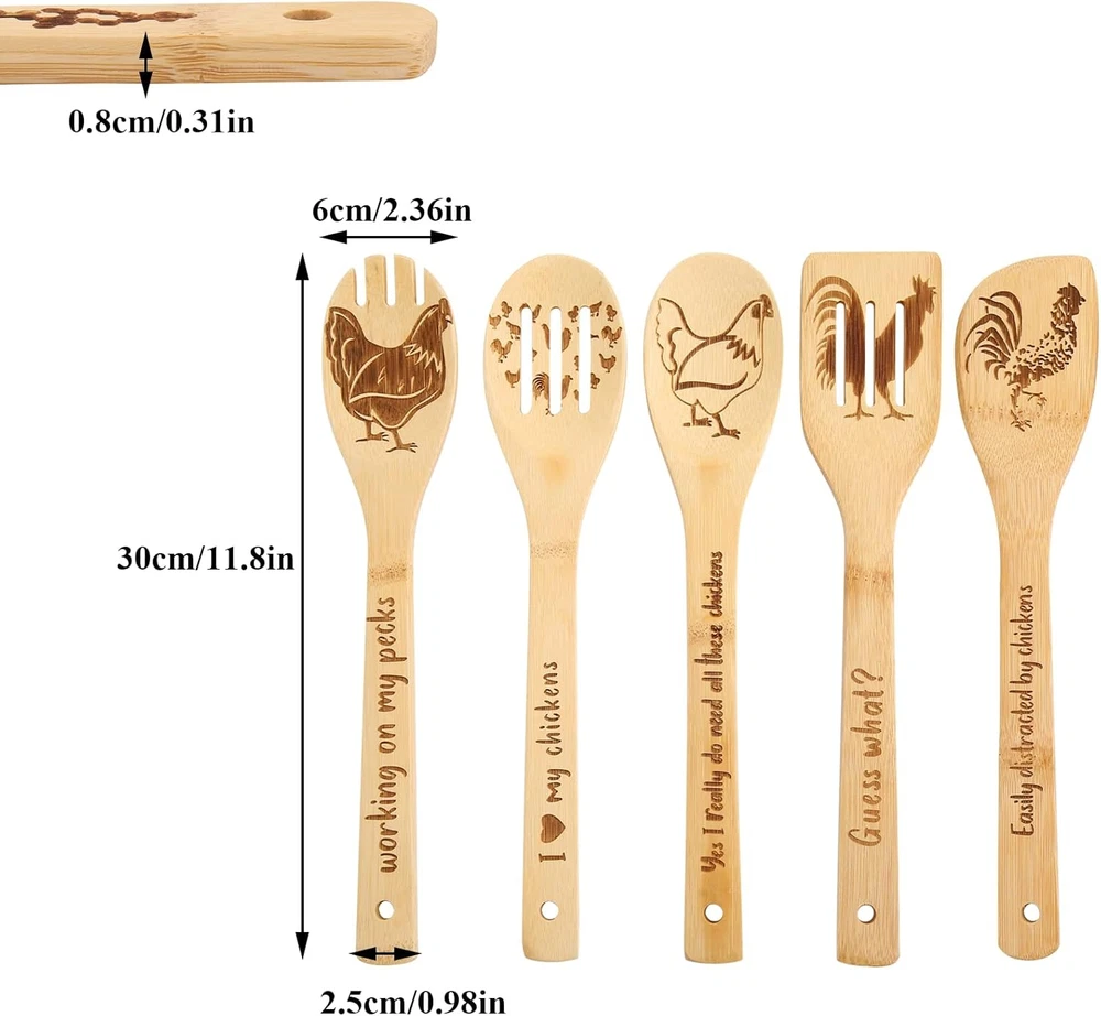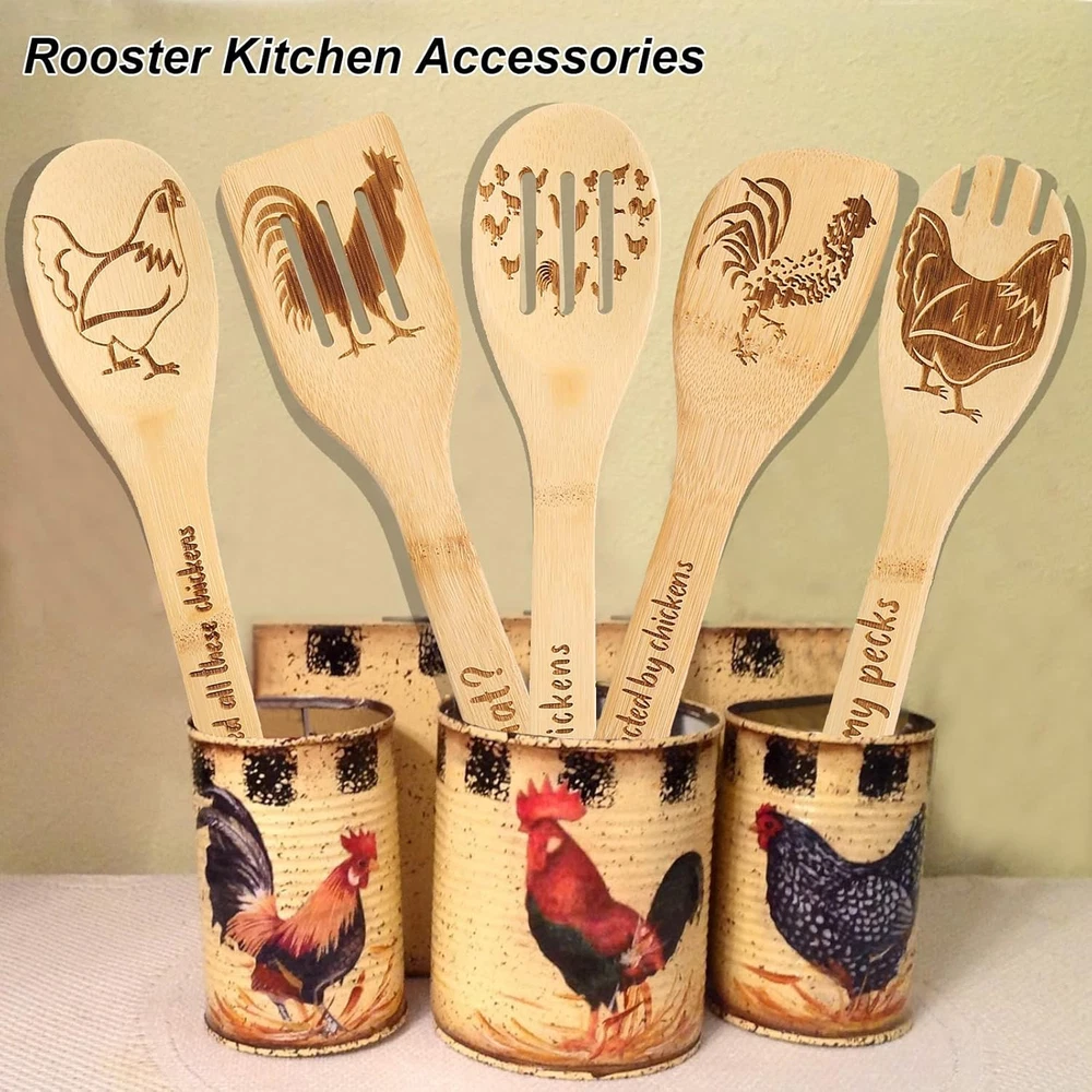 Pioneer Woman Kitchen Stuff - Valentine Rooster Wooden Cooking Spoons Product Details Item Weight: 0.5 Pounds Number of Pieces: 1 Is Dishwasher Safe: No Material Type Free: Free of any materials other than wood Handle Width: 4.7 Inches Product Dimensions: 11.9 x 2.35 x 0.01 inches Item Weight: 8 ounces Manufacturer: c-1 Country of Origin: Hong Kong Item model number: c-1 Color: Rooster Wooden Cooking Spoons Material: Wood Brand: BamWelt Style: Rooster Wooden Cooking Spoons Product Dimensions: 11.9"L x 2.35"W Pioneer Woman Kitchen Stuff:Are you a lover of all things farm and roosters? Then this Valentine chicken decor is for you! These rooster wooden spoons set are useful as well beautiful, Wake your family up with the smell of a home cooked breakfast in the morning with the help of our chicken accessories. No one denies that the kitchen is the heart of the home and the ultimate gathering spot for family and friends. Multifunction:These pioneer woman kitchen stuff includes solid spoon, rounded folk, slotted spoon, slotted spatula, mixing spoon. 5 pieces of rooster kitchen decor to meet all your cooking needs, lightweight and durable solid wooden cooking utensils, you can use these Valentine bamboo utensils for high heat sauteing, baking, mixing, flipping. Can be used to decorate the pioneer woman kitchen and also to cook. Premium: This rooster kitchen decor set is crafted from nonstick wood, keep the original taste of the food, wood material protects your cookware from scratches.Due to the wood, color will changes with prolonged use, but trust me, it adds unique beauty. Easy To Clean:Easily clean the pioneer woman kitchen stuff by hand washing with mild detergent in warm water, then wiped clean with paper towels or sponges, the hole in the Valentine spoon allows you to hang chicken decor or store it in a drawer. Chicken Valentine Gifts:These rooster kitchen decor is the ideal chicken gifts for women,and this makes the perfect gift for all your lovers'birthdays, Valentin, housewarmings, weddings, holidays, mom's anniversary kitchen. Great pioneer woman kitchen stuff for friend, coworker, rooster theme party, christmas.
