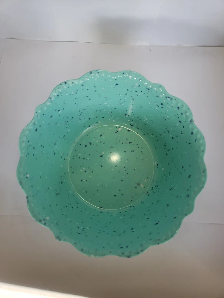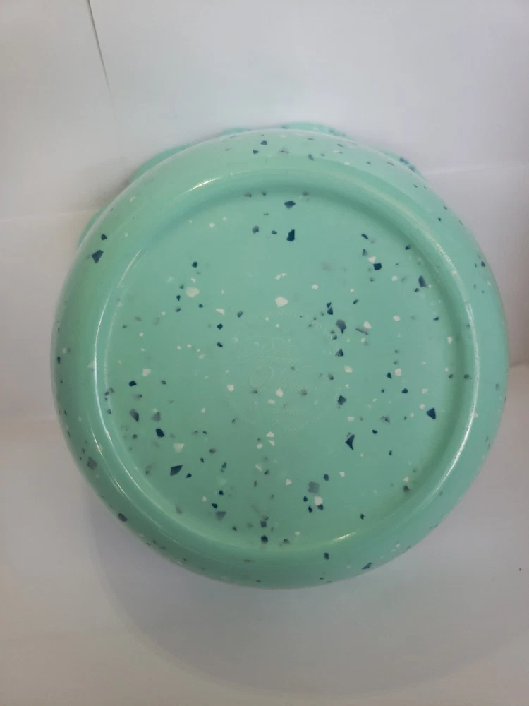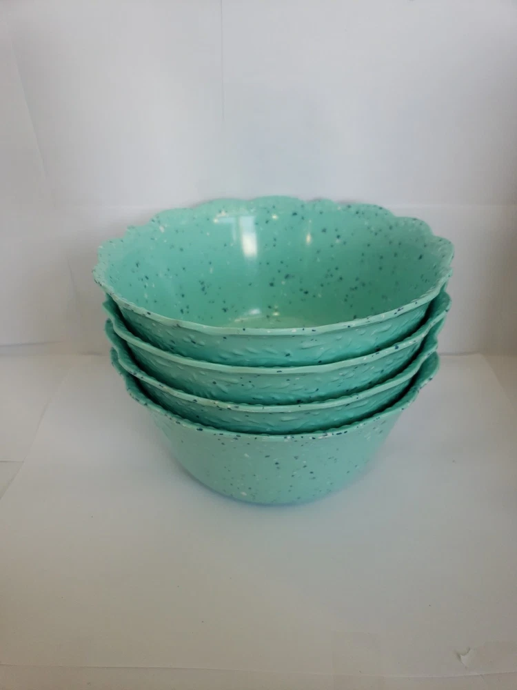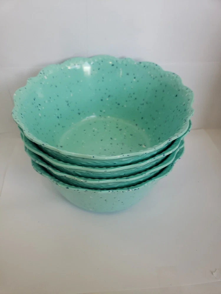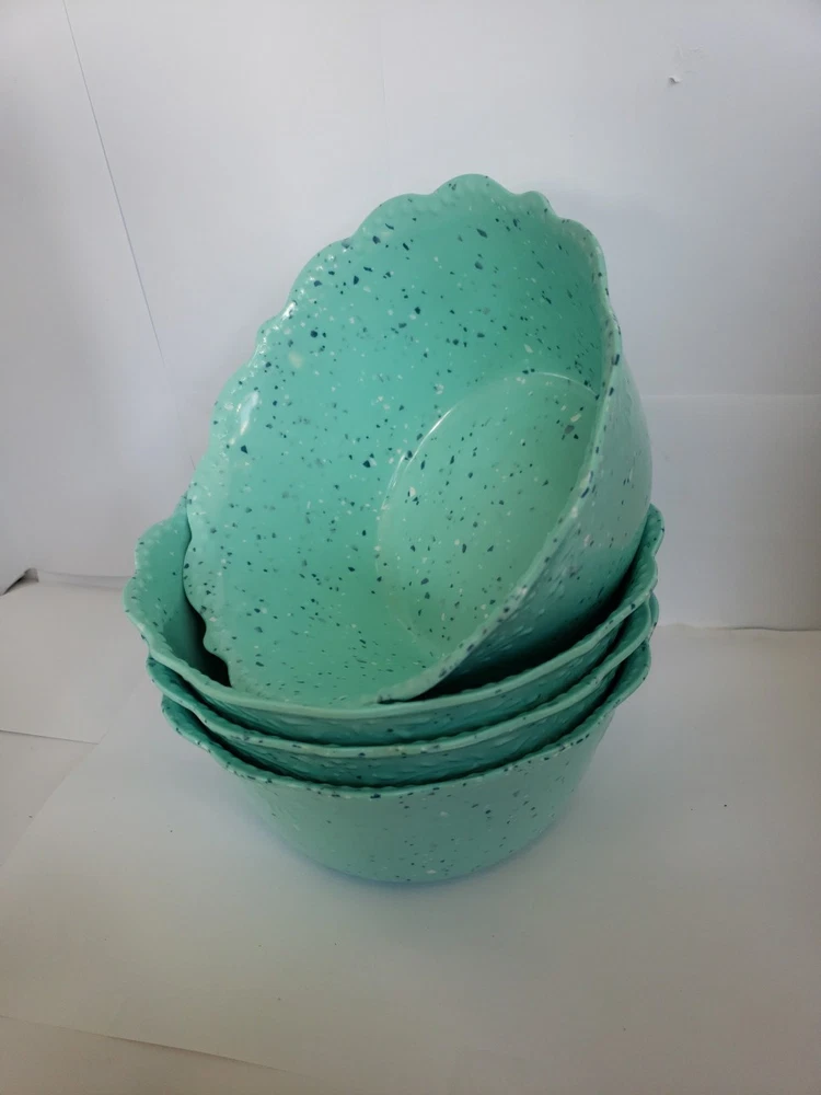 This is a set of 4 Pioneer Woman Juliette Teal Speckled 6.5" dinner bowls made of blue melamine. Each bowl features a vibrant speckled pattern on the interior and exterior of the bowl.