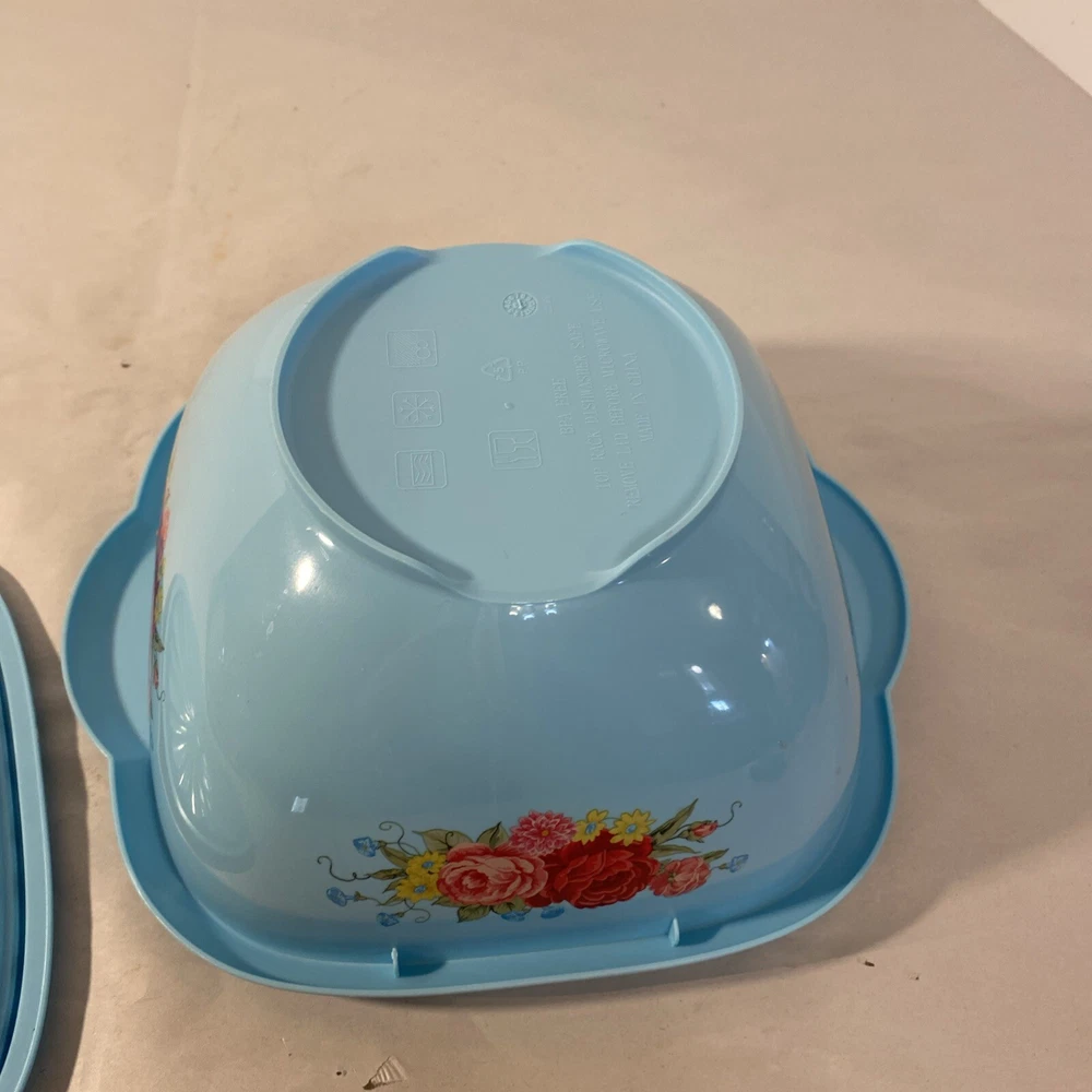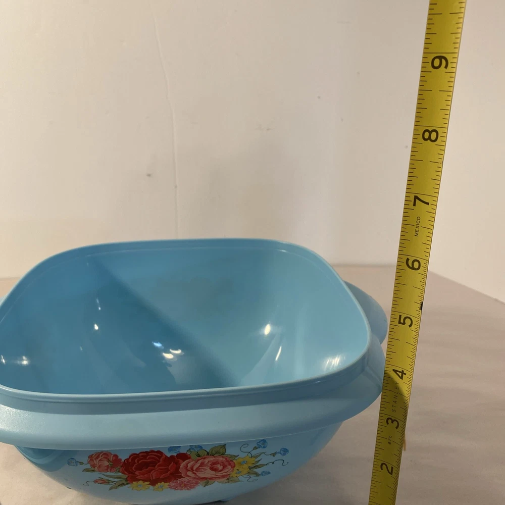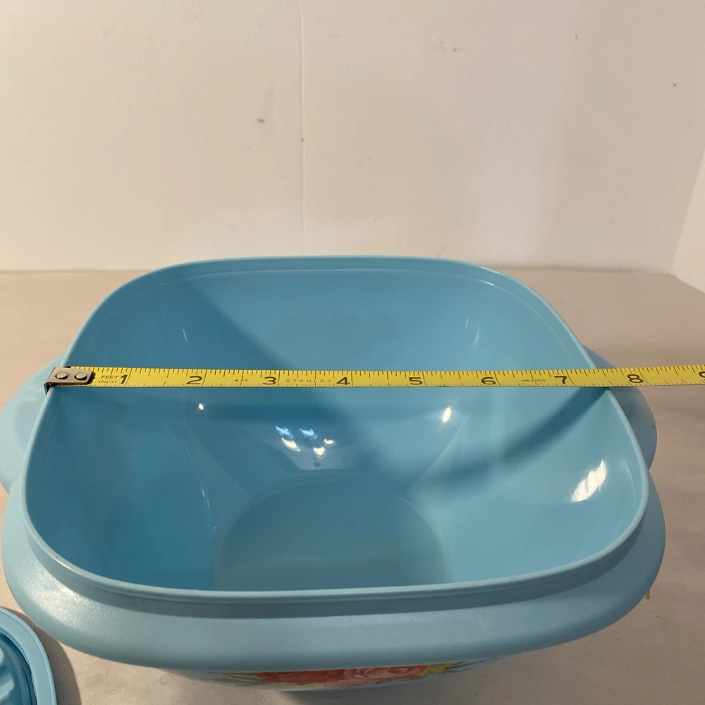 Country/Region of Manufacture:ChinaLid Type:Snap LidNumber of Items in Set:1Features:Reusable, With LidMaterial:PlasticTheme:RoseType:Storage BowlBrand:Pioneer WomanItem Height:4.5 inItem Width:8 inShape:SquareColor:Turquoise blueItem Length:8 inPattern:Floral