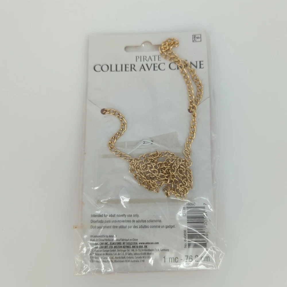 Enhance your pirate costume with this stunning 30" goldtone necklace adorned with a skull hat and swords. The necklace is designed by AMSCAN, a leading brand in costume accessories. Perfect for themed parties or Halloween, the necklace is sure to add a touch of adventure to your outfit. Made in China, this high-quality necklace features a gold color that complements any pirate outfit. Personalization is not available for this item. Get ready to set sail and conquer the seas with this must-have pirate accessory!
