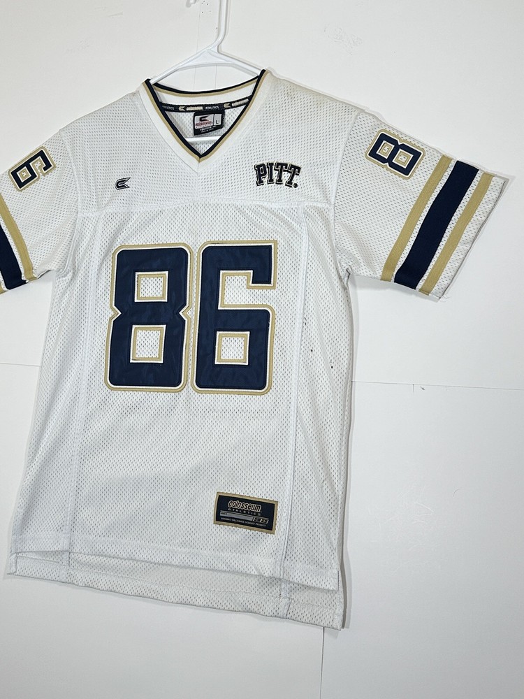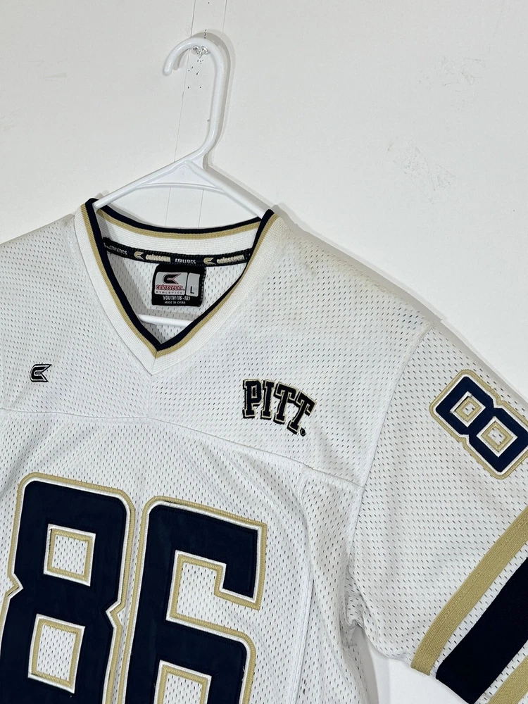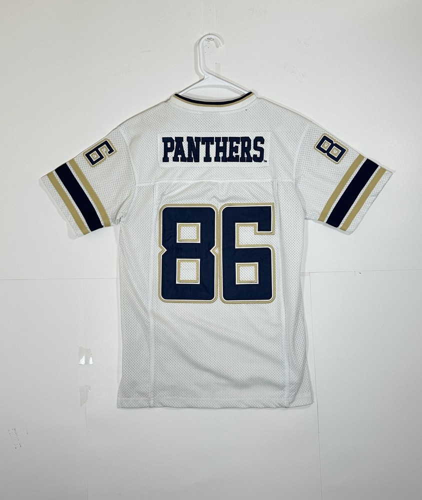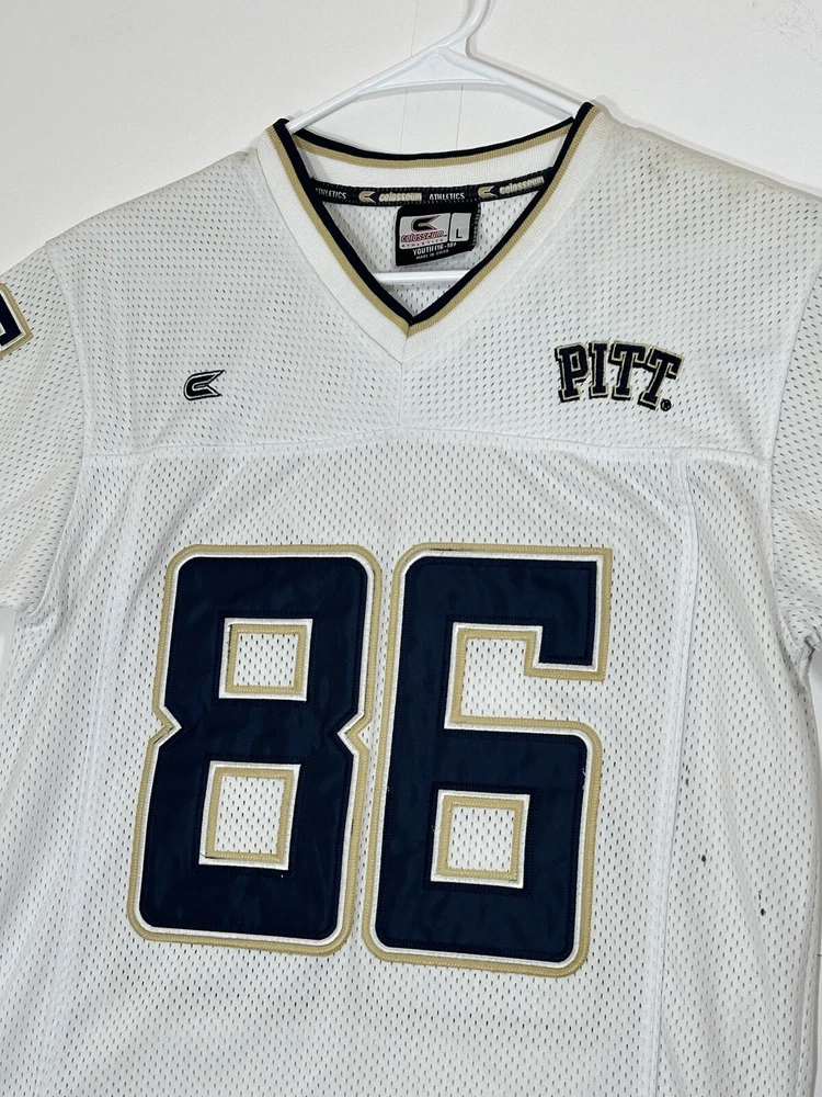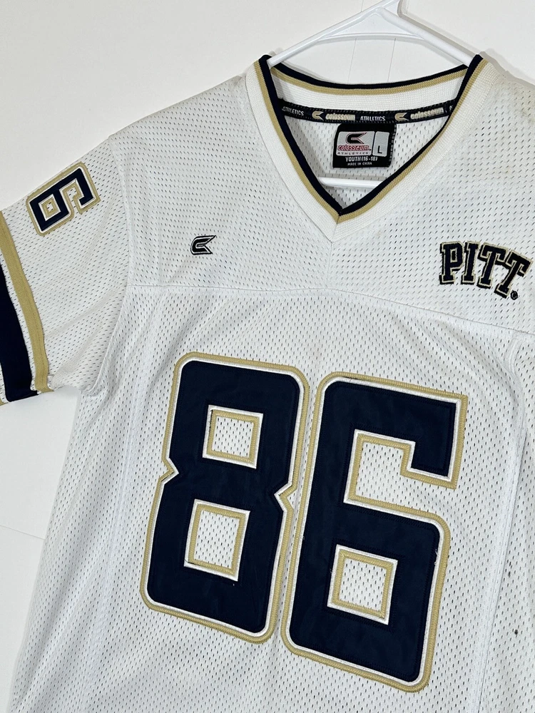 Pitt Panthers Jersey Youth Boys Large 16-18 White Stitch Logo Kids Football #86 Very decent - to - pretty good condition overall - see ALL photos very closely Jersey has light minor wear/tear overall throughout - has a couple little stains/marks on front side near middle - little bit upper portion - see ALL photos very closely for condition of the jersey Will ship with care