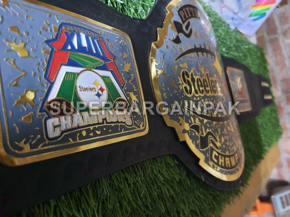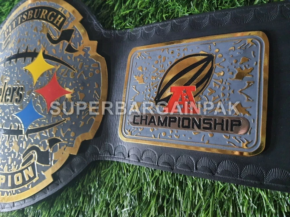 Welcome to our shop ------------------------------------------- We are specialist in manufacturing handmade products:: Our wide range of products include: >>>>Championship Belts WWE | WWF | AEW | UFC | WBC | WCW Product Description ** Pittsburgh Steelers Championship Belt *** Plate Metal: Brass (Zinc available on request with additional cost) Strap: 100% Leather Largest Waist Size: Fits upto 46'' Belt Length: ~50" Weight: 4.17 lbs | 2.01 Kg Plate Thickness: 2mm (4mm Version available on demand with additional cost) ::The belt is well crafted and manufactured to meet the quality demands of fans:: Get your hands on this marvelous piece now! Note: If you need further details kindly inbox us, we will try to be as responsive as possible. ------------------------------------------- Return Policy: Generally we don't have much complains on our products and we make sure to 100% satisfy our clients. We send the product in well Bubble Wrapped packaging so there is highly unlike chance of getting damaged item. In case there is a damage, we will try to give partial refund or you can ask for full refund within 30 days after returning the belt to origin. NOTE: 1. If you have placed the order by mistake or you have purchased a wrong item then we are not going to refund that. 2. Buyer will pay the shipping fee of returning the belt. ------------------------------------------- Happy Shopping! :)
