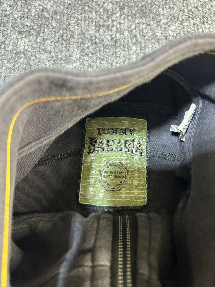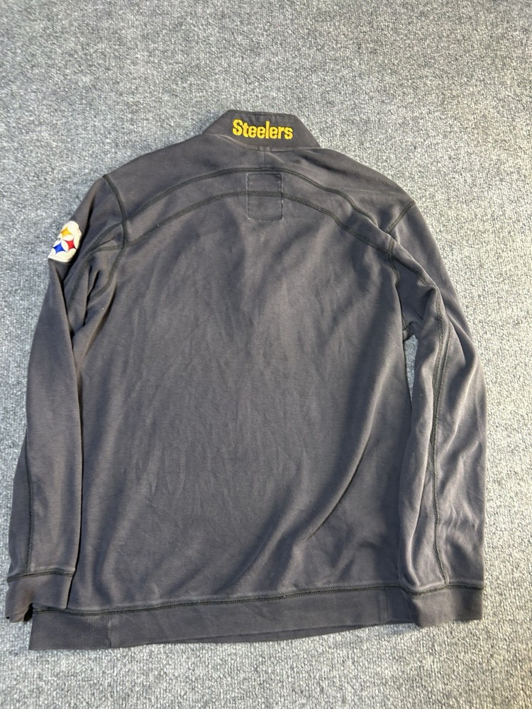 The product is a Pittsburgh Steelers Tommy Bahama sweater for men in size medium. This gray 1/4 zip pullover sweatshirt features a sports theme, ideal for fans of the Steelers. Made in the Bahamas, this sweater combines style and comfort, perfect for casual wear or showing team spirit at football games.