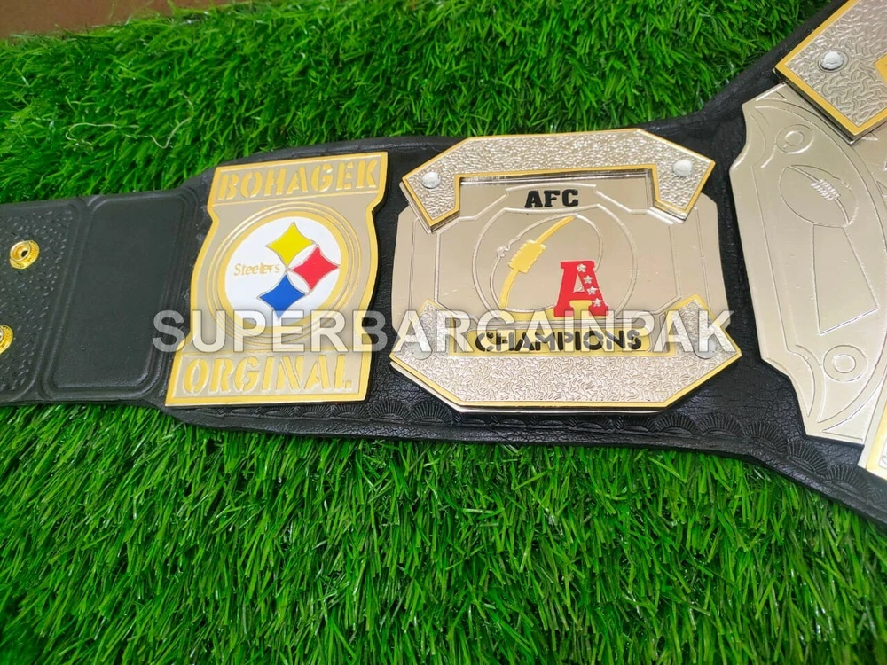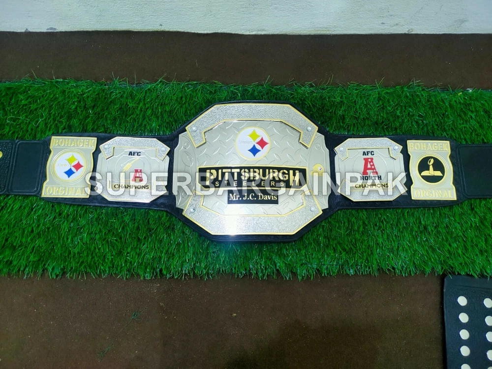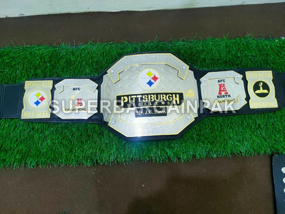Welcome to our shop ------------------------------------------- We are specialist in manufacturing handmade products:: Our wide range of products include: >>>>Championship Belts WWE | WWF | AEW | UFC | WBC | WCW Product Description ** Pittsburgh Steelers championship belt *** Plate Metal: Brass (Zinc available on request with additional cost) Strap: 100% Leather Largest Waist Size: Fits upto 46'' Belt Length: ~50" Weight: 6.17 lbs | 2.81 Kg Plate Thickness: 2mm (4mm Version available on demand with additional cost) ::The belt is well crafted and manufactured to meet the quality demands of fans:: Get your hands on this marvelous piece now! Note: If you need further details kindly inbox us, we will try to be as responsive as possible. ------------------------------------------- Return Policy: Generally we don't have much complains on our products and we make sure to 100% satisfy our clients. We send the product in well Bubble Wrapped packaging so there is highly unlike chance of getting damaged item. In case there is a damage, we will try to give partial refund or you can ask for full refund within 30 days after returning the belt to origin. NOTE: 1. If you have placed the order by mistake or you have purchased a wrong item then we are not going to refund that. 2. Buyer will pay the shipping fee of returning the belt. ------------------------------------------- Happy Shopping! :)