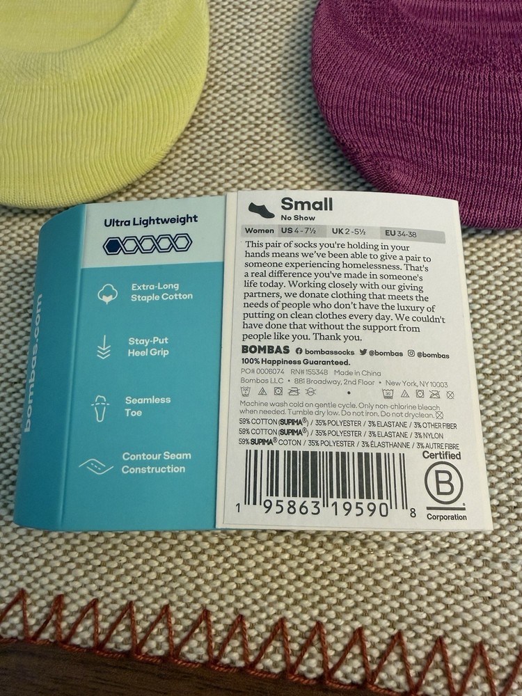 The Bombas Ultra Lightweight No Show Socks for women in US size 4-7 1/2 are perfect for everyday and casual occasions. Made from cotton, these socks are machine washable and feature a solid multicolor design. They are cushioned and lightweight, making them comfortable for walking and all seasons use. The no-show style with a full toe design ensures they stay hidden and provide the support needed for active wear. Bombas is a trusted brand known for quality and durability, making these socks a reliable choice for your wardrobe.