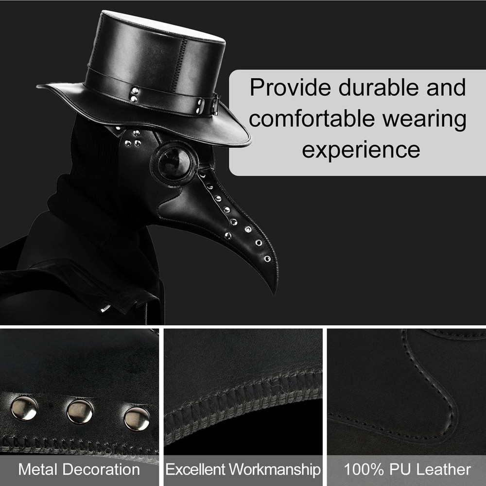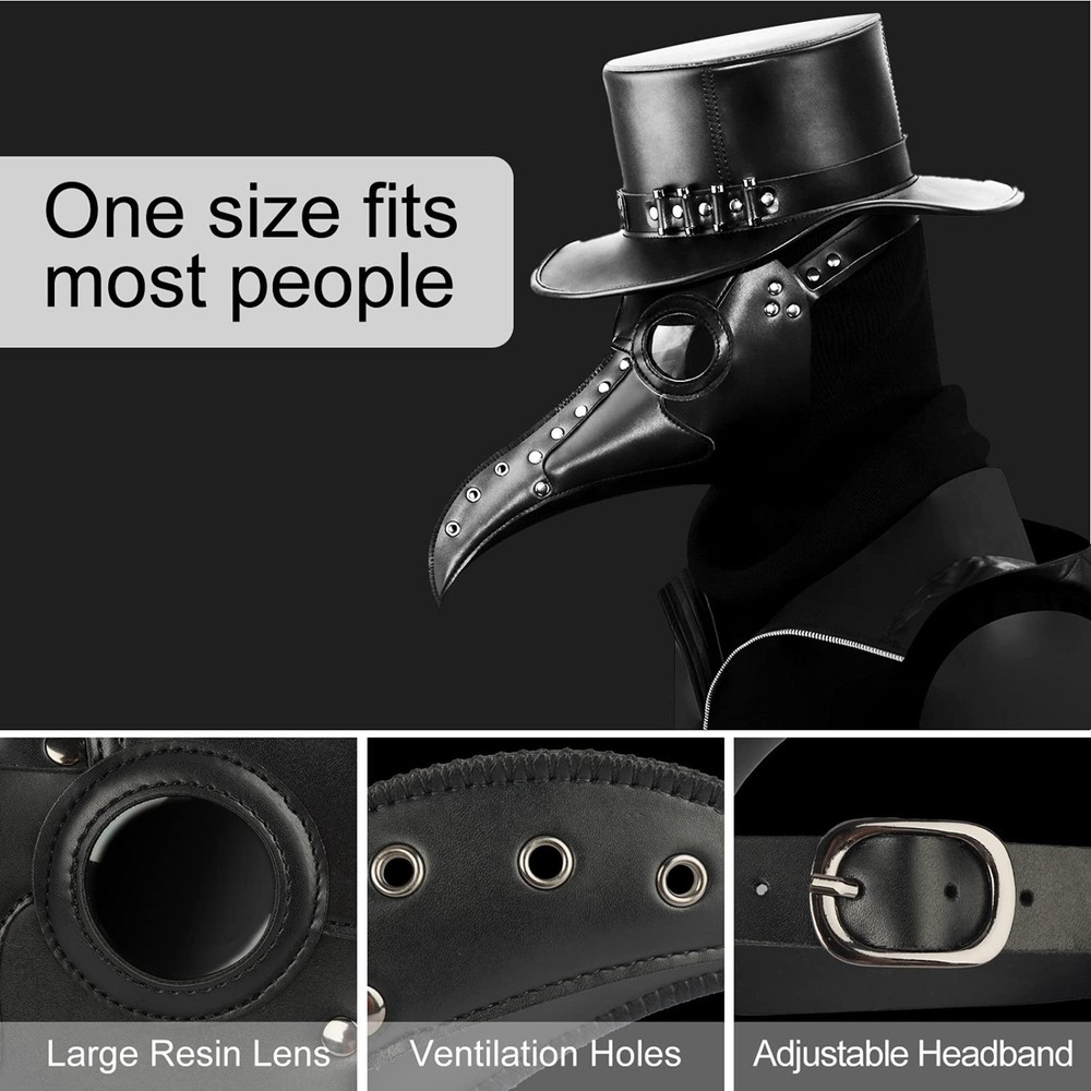 Plague Doctor Mask Steampunk Faux Leather Halloween Cosplay Costume Transform your look instantly with this striking, high-quality **Steampunk Plague Doctor Mask**. Perfect for creating an eerie, historically inspired, and unforgettable character. Whether for a **Halloween** party, **Cosplay** event, or a themed **Masquerade**, this long bird-beak mask is a must-have prop. Key Features & Benefits Authentic Steampunk Design: Features the iconic long-nose 'bird beak' design, often detailed with **Gothic** and industrial accents. Comfortable & Adjustable Fit: Equipped with secure, multi-point **adjustable straps** to ensure a perfect and comfortable fit for most **adult** head sizes. Durable Material: Crafted from premium, easy-to-clean **Faux Leather** (PU Leather) for long-lasting use and a rugged, authentic appearance. Enhanced Breathability: Includes functional ventilation **grommet holes** underneath the beak for easier breathing during extended wear. High Visibility: Features tinted lenses/eye holes that maintain the mysterious look while offering clear visibility. Specifications & Use Cases This full-face **Black** mask elevates any outfit. Its versatility makes it ideal for a wide range of costumed events: **Halloween** The ultimate spooky and historically macabre **prop**. **Cosplay & LARP** Perfect for **Steampunk**, Victorian, Gothic, or Medieval themed characters. **Themed Parties** A stunning accessory for **Masquerade** balls and festive events. Grab this essential Adult Costume Accessory to make a statement at your next event!