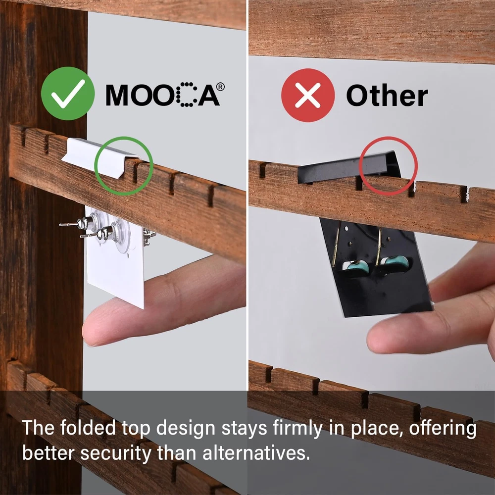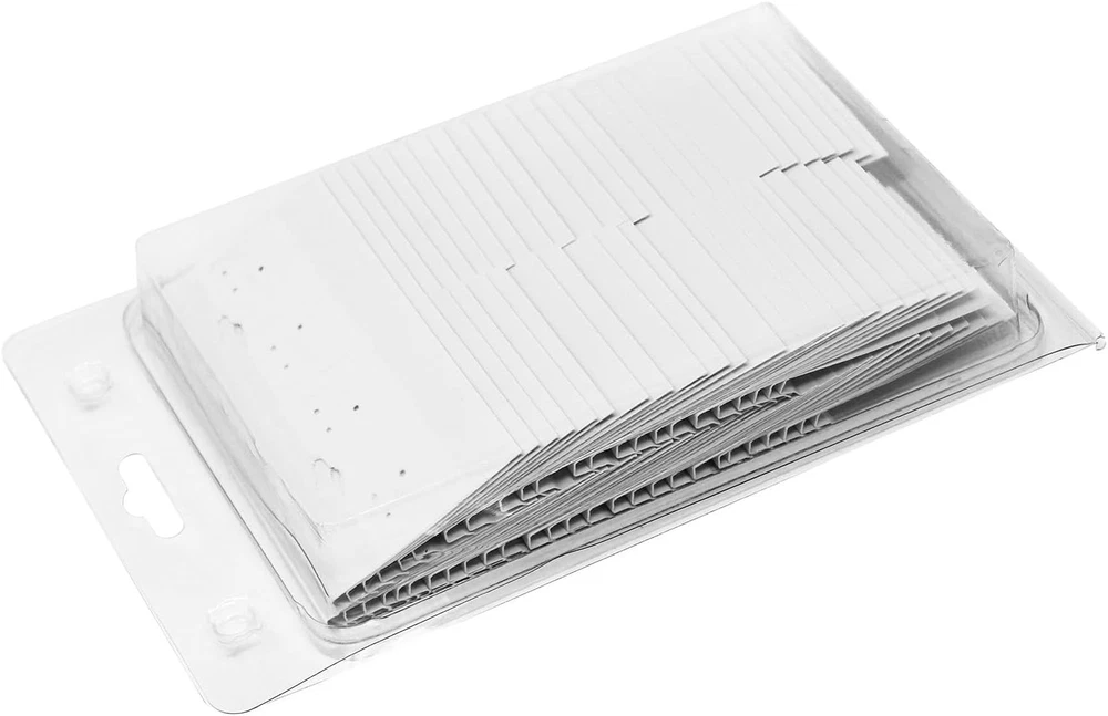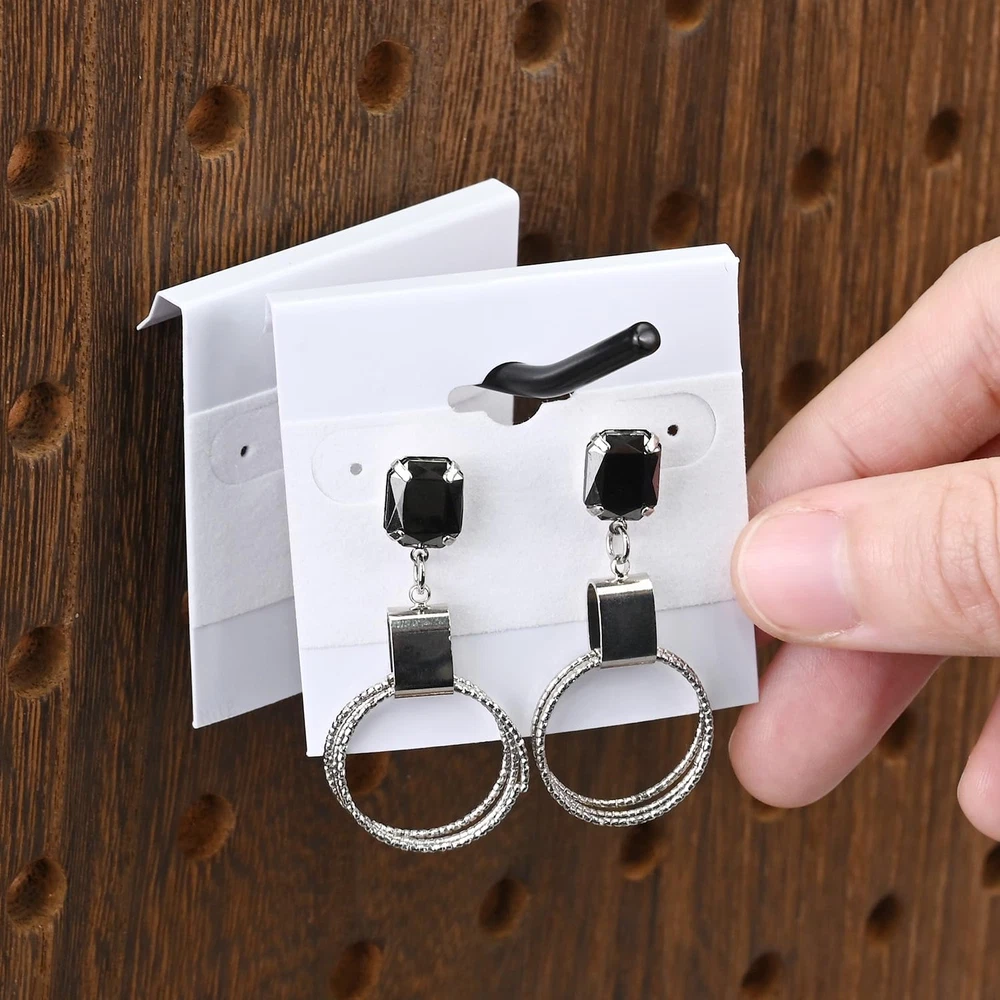 HANGING EARRING CARDS - 100 high-quality hanging earring cards with 6 holes to hold various earrings such as studs, clusters, drops, hoops, chandeliers, Halo, huggie, and climber earrings. EARRING DISPLAY- Elevate your jewelry display with our sophisticated White Velvet Fabric Earring Cards. These elegant fold-out tab earring cards offer both style and security, all while boasting a luxurious black velvet fabric for an undeniably sleek aesthetic. Earring Organizer: Our earring cards can efficiently store or display earrings, offering space-saving and organizational benefits. EARRING ORGANIZER: We provide the best hanging earring cards. With two decades of experience in the United States market, we have gained a deep understanding of our customer's requirements, allowing us to tailor both the quality and design of our products to meet your needs. MATERIAL & SIZE - Flocked plastic; Overall: 2"W x 2"H Official MOOCA product. Accessories are NOT included Product Description FEATURES Perfect and elegant earring cards for hanging earrings. Featuring precut 6 holes which are suitable for a variety of earrings. Perfect for organizing your earring in place. Made of high-quality plastic and come in a pack of 100 pieces. Elegant and sophisticated earring cards Sleek and simple This plain white plastic earring card holder is sleek and simple. Illuminating your earrings on display. Pack of 100 pieces These cards come in a pack of 100 pieces for multiple earrings. For a variety of earrings. Efficient and practical design The earring card can be hung in 2 different ways. Either on a rack or a hook. Perfect for displays This earring card is perfect for displaying at trade shows, shops, etc. Easy to use and saves space. 100 Pcs Hanging Earring Card Holders, Plain White Overall: 2"W x 2"H each