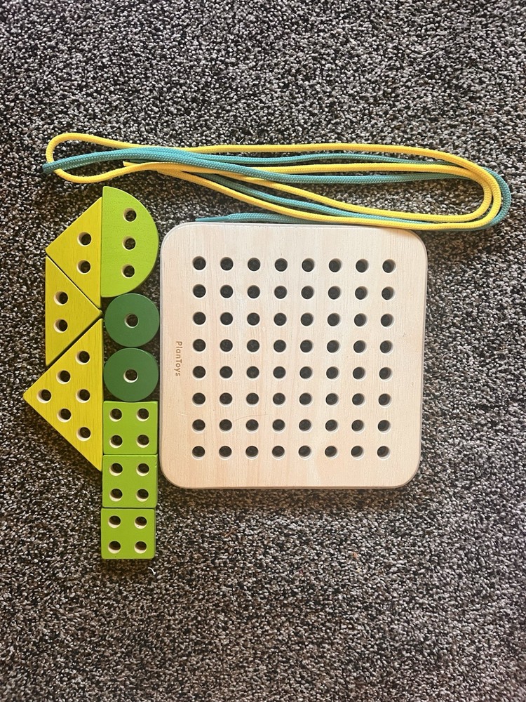 The Plan Toys Lacing Board is a colorful wooden toy designed for toddlers by PlanToys. This unisex toy helps develop motor skills and coordination as children practice lacing the different colored pieces together. Made from sustainable materials, this wooden toy is durable and perfect for young children to play and learn with. Like new.