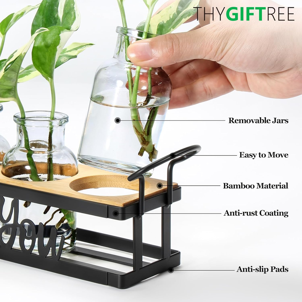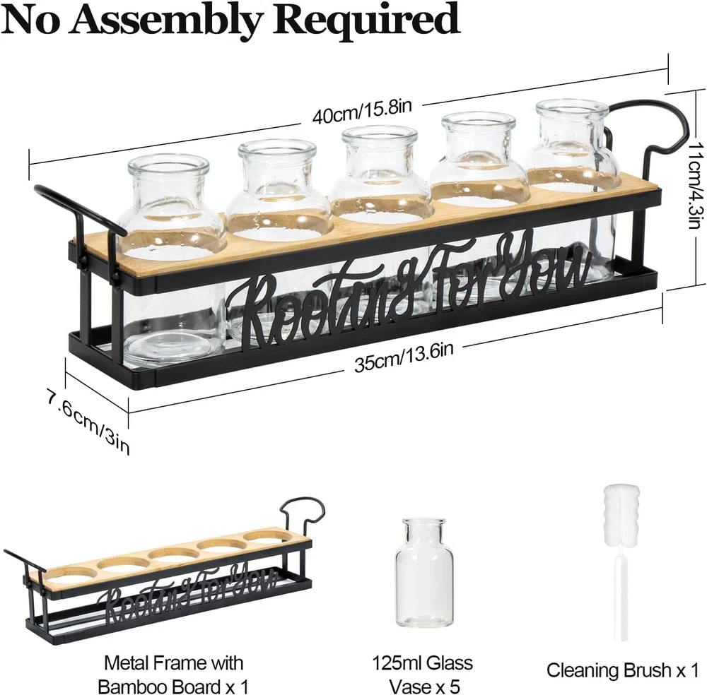 Plant Propagation Stations, Mothers Day Plant Lover Gifts for Mom Women Rooting for You Propagate Jars for Hydroponic Cuttings Propagating Vase Plant Rooting Station: This minimalist and stylish planter terrarium works well for propagating house plant cuttings. Each large-capacity propagation jar provides plenty of space for rooting plants, allowing you to observe the growth process and enjoy the fun of plant care Thoughtful Design: The metal tray comes with anti-skid pads on the bottom to enhance its stability, ensuring the propagation glass planter can be placed anywhere safely without being knocked over or dropped easily. The handles for easy movement. The open mouth jars don't hinder the growth of plants and can be removed for water changes and cleaning Useful and Decorative: This hydroponic plant holder, with its simple and elegant appearance, will be an eye-catching decoration for your home or office. Display lovely plants or flowers such as pothos, monstera, ivy, mint, verbena, African daisy, violets and more, on your desk, windowsill, counter or shelf, adding natural green and freshness to your life Great Gift Idea: This functional and beautiful propagate station with "Rooting for You" makes an elegant gift for plant lovers or gardening enthusiasts. It can be a wonderful gardening gifts, birthday gifts for plant mom, house warming gifts for new home, wedding gifts for couple or get well soon gifts for women No Assembly Required: The propagation kit is already assembled and ready to use. Package Includes: 1 x black metal stand with board, 5 x 4.4 oz bottles, 1 x cleaning brush. Note: Plants Not Included. If any part of your received item is less than perfect, please let us know, we will do our best to solve the problem within 24 hours Product Description THYGIFTREE desktop plant propagation station with Rooting for You metal stand provides a simple and stylish way to propagate hydroponic plant cuttings or flower buds you like, incorporating natural green freshness into life. Propagate Your Plant Baby Each propagation jars provide enough space for rooting plants, allowing you to observe the growth process and enjoy the fun of plant care. A Beautiful Home Decoration This hydroponic plant holder, with its simple and elegant appearance, will be an eye-catching decoration for your living room, bedroom, kitchen or office. Display lovely plants or flowers such as pothos, monstera, ivy, mint, verbena, African daisy, violets and more, on your desk, windowsill, counter or shelf, adding natural green and freshness to your life. Great Gift Idea for Plant Lovers This functional and beautiful propagate station with "Rooting for You" makes a lovely gift for plant lovers or gardening enthusiasts. It can be a wonderful gardening gifts, birthday gifts for mom, house warming gifts for new home, wedding gifts for couple or get well soon gifts for women. 5.31 inches x 15.91 inches x 3.43 inches. Weight: 2.7 lb Planter Form Plant Pot Item model number 4221 Style Simple Number of Levels 1 Capacity 4.4 ounces Indoor/Outdoor Usage Indoor Mounting Type Tabletop Color Rooting for You Special Feature Durable Material Glass, Metal Shape Rectangular Plant or Animal Product Type plant Item Weight 2.7 pounds Theme Plant Item dimensions L x W x H 13.6 x 3 x 4.3 inches Number of Pieces 1 Finish Type Polished, Powder Coated Product Dimensions 13.6 x 3 x 4.3 inches