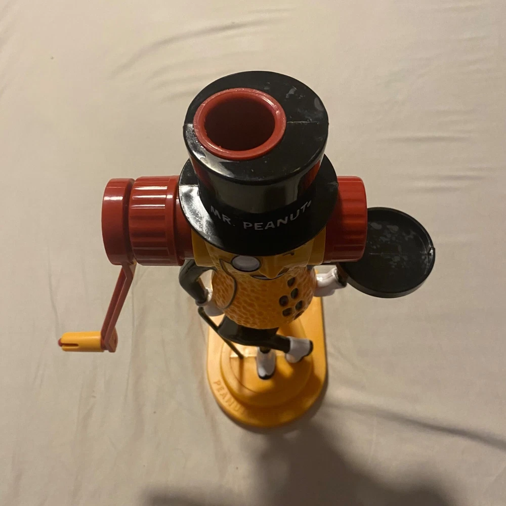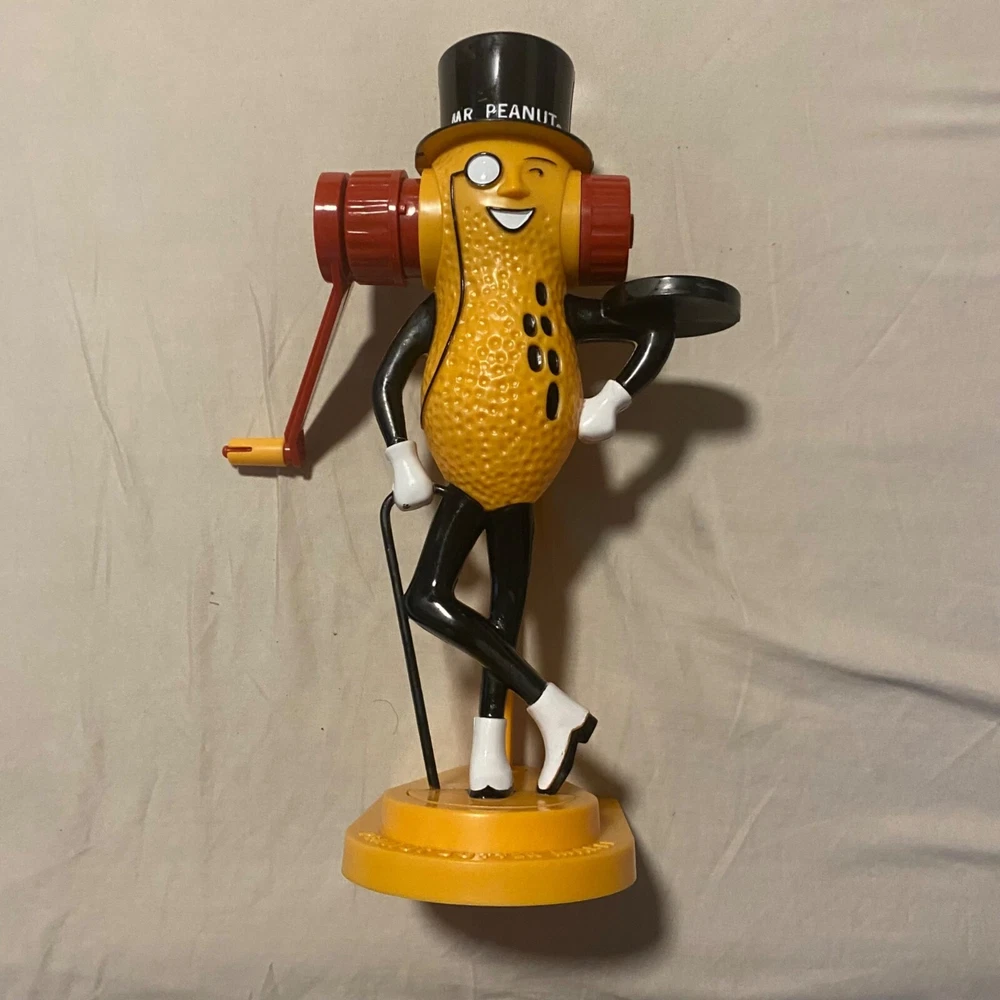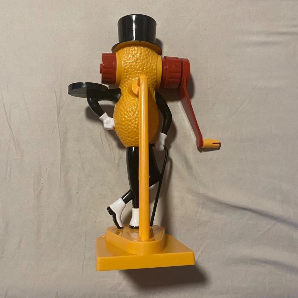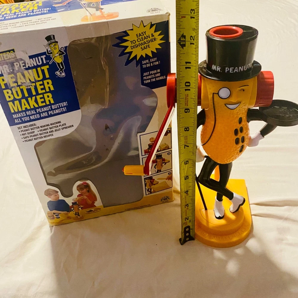 Who knew making peanut butter could be this much fun? With Mr. Peanut's charming monocle and top hat, this vintage gadget will have you churning out nutty goodness while dancing a jig. A quirky throwback for peanut enthusiasts who like a side of fun with their spread. • Easy to clean • Dishwasher safe • Requires peanuts • Vintage design from 1978 • Hand crank mechanism Bottom base measures approximately 9 inches in height.