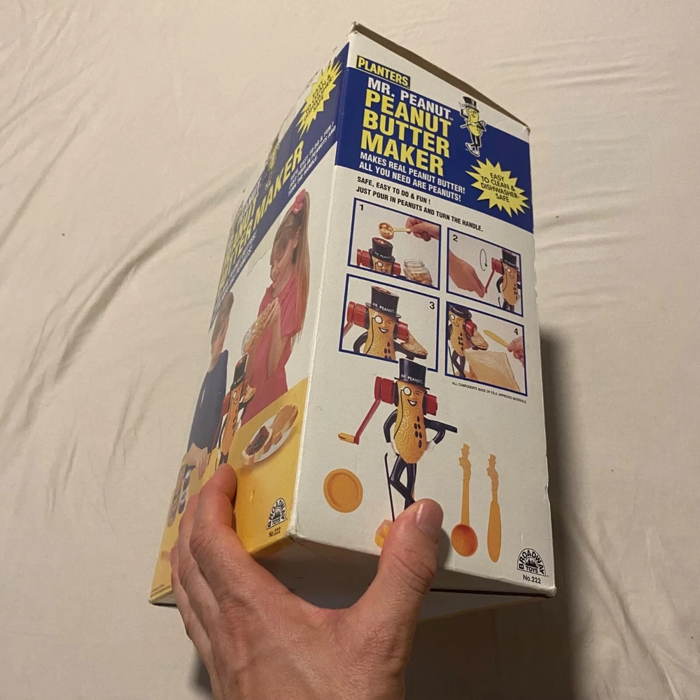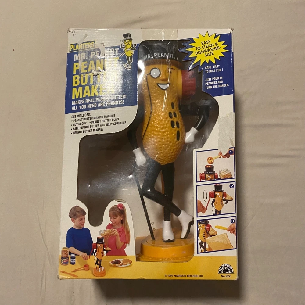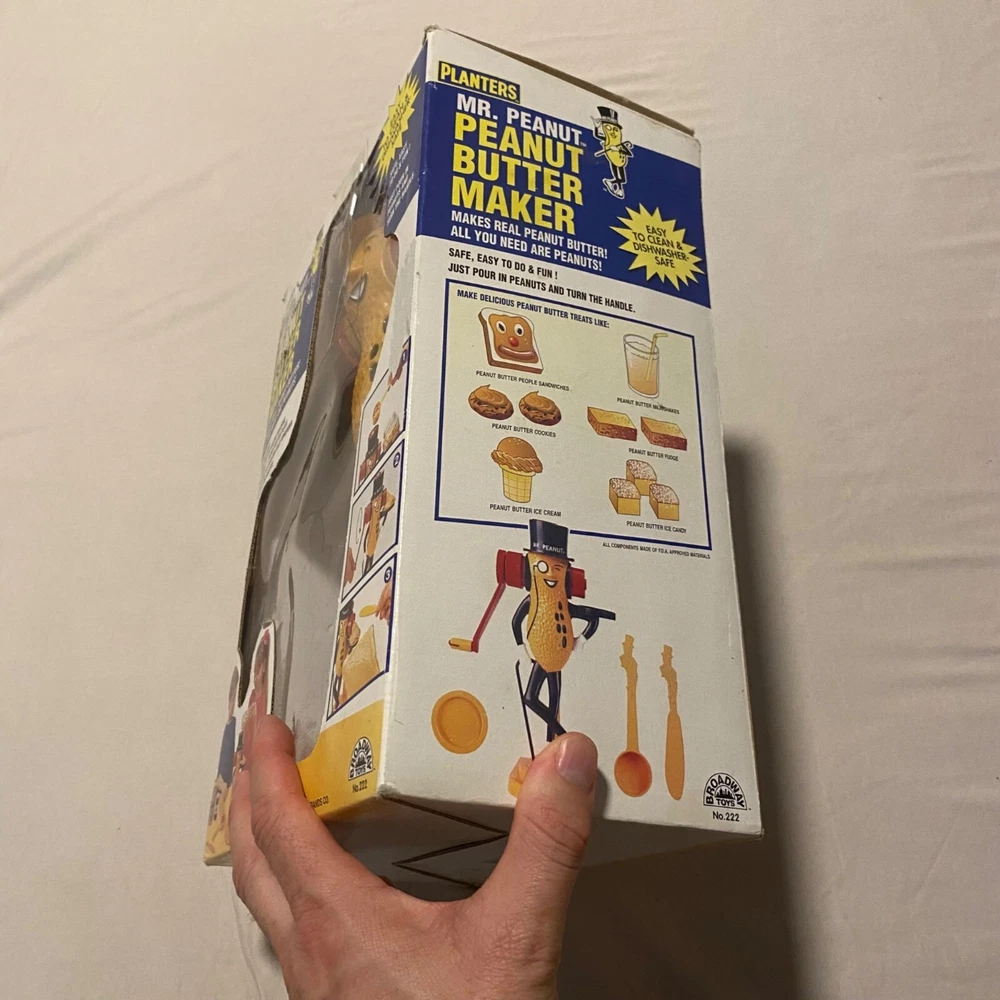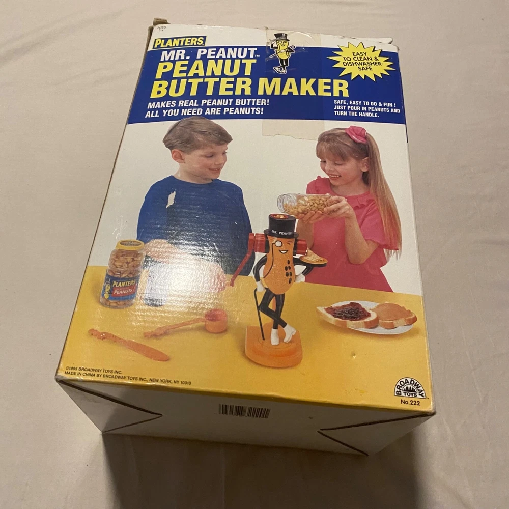 Who knew making peanut butter could be this much fun? With Mr. Peanut's charming monocle and top hat, this vintage gadget will have you churning out nutty goodness while dancing a jig. A quirky throwback for peanut enthusiasts who like a side of fun with their spread. • Easy to clean • Dishwasher safe • Requires peanuts • Vintage design from 1978 • Hand crank mechanism Bottom base measures approximately 9 inches in height.