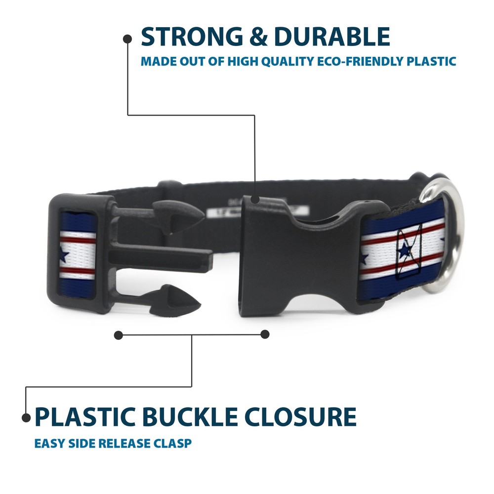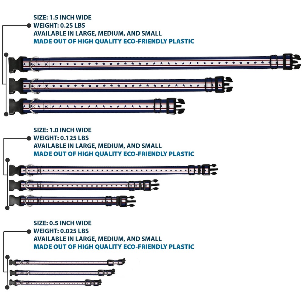 Further Details Title: Plastic Clip Collar Americana Stars & Stripes 6 Blue/White/Red Large 15-24" Condition: New Release Date: 09/02/2017 Item Weight: 72g Item Height: 25mm Age Level: All Life Stages Brand: Buckle-Down Designs MPN: W30193-1.0-L Item Length: 660mm Size: 1" Wide - Fits 15-24" Neck - Large Number of Items: 1579 Type: Dog Collar Plastic Clip Buckle Material: Polyester Pattern: Dog Dimensions: 26 x 1 x 1 inches; 2.56 ounces Item Width: 25mm Color: Blue Description: Vibrant and bold, this beautiful, polyester dog collar is made to show off your dog's unique style through all the seasons. With an overengineered plastic buckle and strong D-ring, this durable collar can hold up to whatever your dog can dish out. This product is officially licensed by Buckle-Down. Dog Breed: All Breed Sizes Closure: Buckle Fits 15-24" neck size and is 1" wide. Vibrant and bold, this beautiful polyester dog collar is made to show off your dog's unique style through all the seasons. With an overengineered plastic buckle and strong D-ring, this durable collar can hold up to whatever your dog can dish out. This product is assembled in the USA by Buckle-Down and is officially licensed by Buckle-Down. Matching leads/leashes available. Missing Information? Please contact us if any details are missing and where possible we will add the information to our listing.