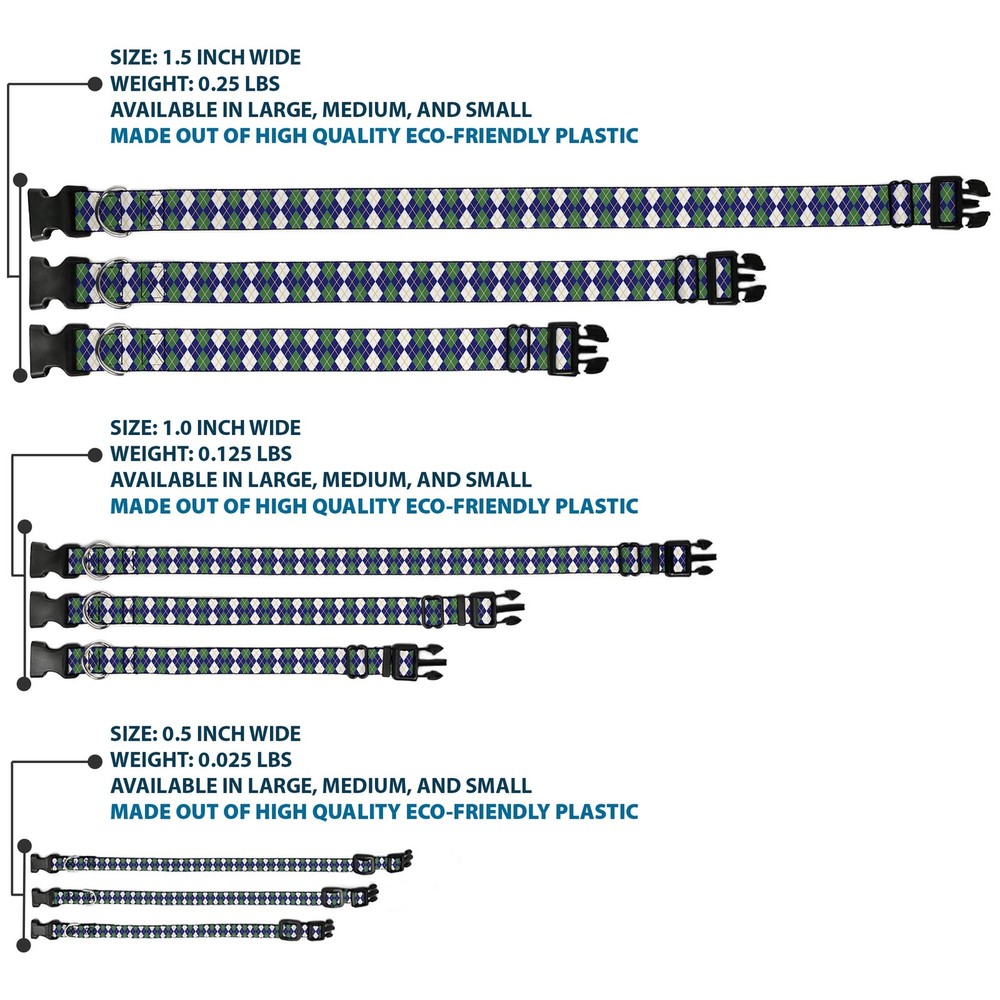 Material: Polyester Brand: Buckle-Down Designs Pattern: Dog,Argyle Type: Dog Collar Plastic Clip Buckle gtin13: 0190882763510 Item Weight: 20g Size: 1/2" Wide - Fits 7-8.5" Neck - Small Item Width: 12mm MPN: W30200-0.5-S Release Date: 03/19/2019 Age Level: ‎All Life Stages Number of Items: ‎1641 Item Length: 228mm Dimensions: 9 x 0.5 x 1 inches; 0.71 ounces Closure: Buckle Dog Breed: ‎All Breed Sizes UPC: 0190882763510 Color: Blue Title: Plastic Clip Collar Argyle Navy/Green/White/Gold NARROW-Small 7-8 Item Height: 25mm
