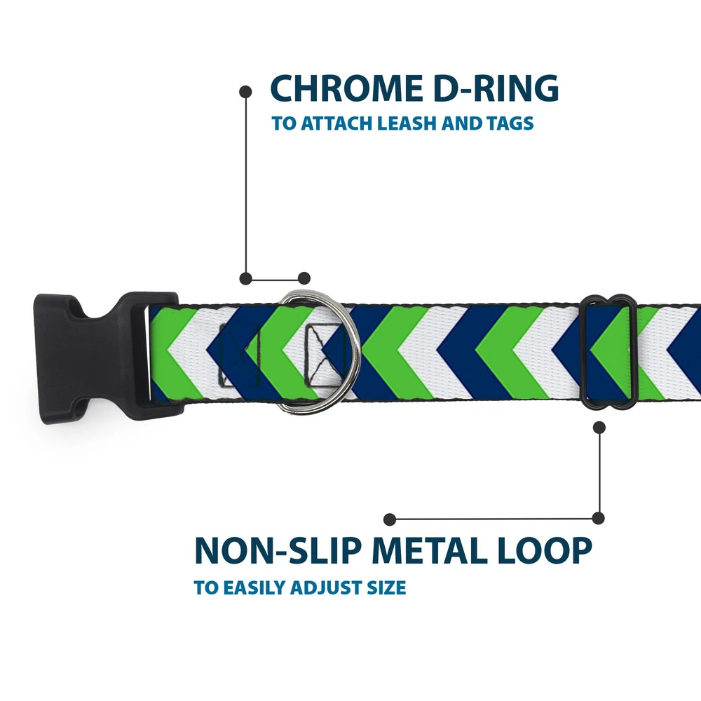 Further Details Title: Plastic Clip Collar Chevron White/Bright Green/Navy NARROW-Large 9.5-14.5" Condition: New Release Date: 03/16/2017 Description: Vibrant and bold, this beautiful, polyester dog collar is made to show off your dog's unique style through all the seasons. With an overengineered plastic buckle and strong D-ring, this durable collar can hold up to whatever your dog can dish out. This product is officially licensed by Buckle-Down. Item Height: 25mm Item Width: 12mm Item Weight: 17g Age Level: All Life Stages Brand: Buckle-Down Designs Color: Multicolor Item Length: 381mm Material: Nylon Number of Items: 19702 Type: Dog Collar Plastic Clip Buckle Dimensions: 15 x 0.5 x 1 inches; 0.6 ounces Size: 1/2" Wide - Fits 9.5-14.5" Neck - Large Closure: Buckle MPN: W35557-0.5-L Dog Breed: All Breed Sizes Fits 9.5-14.5" neck size and is 1/2 inch wide. Vibrant and bold, this beautiful polyester dog collar is made to show off your dog's unique style through all the seasons. With an overengineered plastic buckle and strong D-ring, this durable collar can hold up to whatever your dog can dish out. This product is assembled in the USA by Buckle-Down and is officially licensed by Buckle-Down. Matching leads/leashes available Missing Information? Please contact us if any details are missing and where possible we will add the information to our listing.