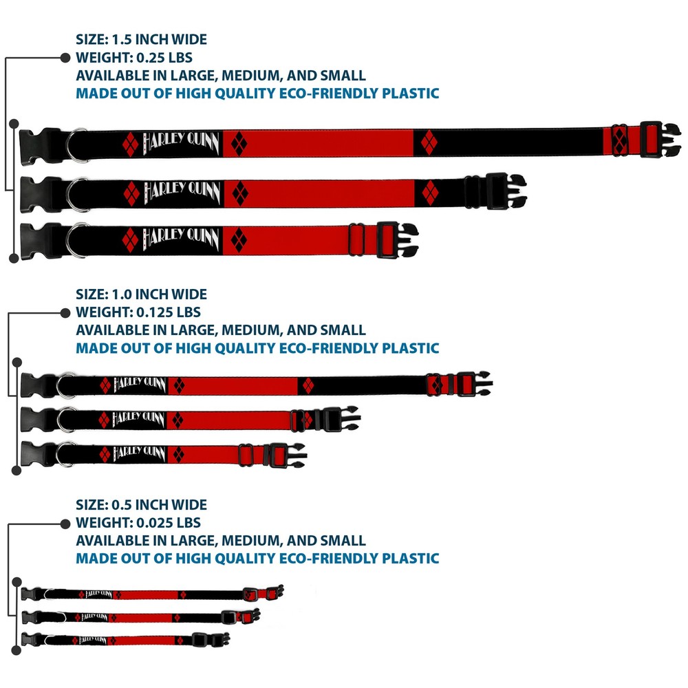 Further Details Title: Plastic Clip Collar HARLEY QUINN/Diamonds Black/Red/White WIDE-Medium 16-23" Condition: New Description: Vibrant and bold, this beautiful, polyester dog collar is made to show off your dog's unique style through all the seasons. With an overengineered plastic buckle and strong D-ring, this durable collar can hold up to whatever your dog can dish out. This product is officially licensed by DC Comics. Age Level: All Life Stages Brand: Harley Quinn Color: Red Closure: Buckle MPN: WJK007-1.5-M Item Weight: 81g Material: Nylon Dimensions: 23 x 1.5 x 1 inches; 2.88 ounces Dog Breed: All Breed Sizes Item Length: 584mm Item Width: 38mm Item Height: 25mm Size: 1.5" Wide - Fits 16-23" Neck - Medium Number of Items: 50605 Type: Dog Collar Plastic Clip Buckle Pattern: Dog Release Date: 03/16/2017 Fits 16-23" neck size and is 1.5" wide. Vibrant and bold, this beautiful polyester dog collar is made to show off your dog's unique style through all the seasons. With an overengineered plastic buckle and strong D-ring, this durable collar can hold up to whatever your dog can dish out. This product is assembled in the USA by Buckle-Down and is officially licensed by DC Comics. Matching leads/leashes available Missing Information? Please contact us if any details are missing and where possible we will add the information to our listing.
