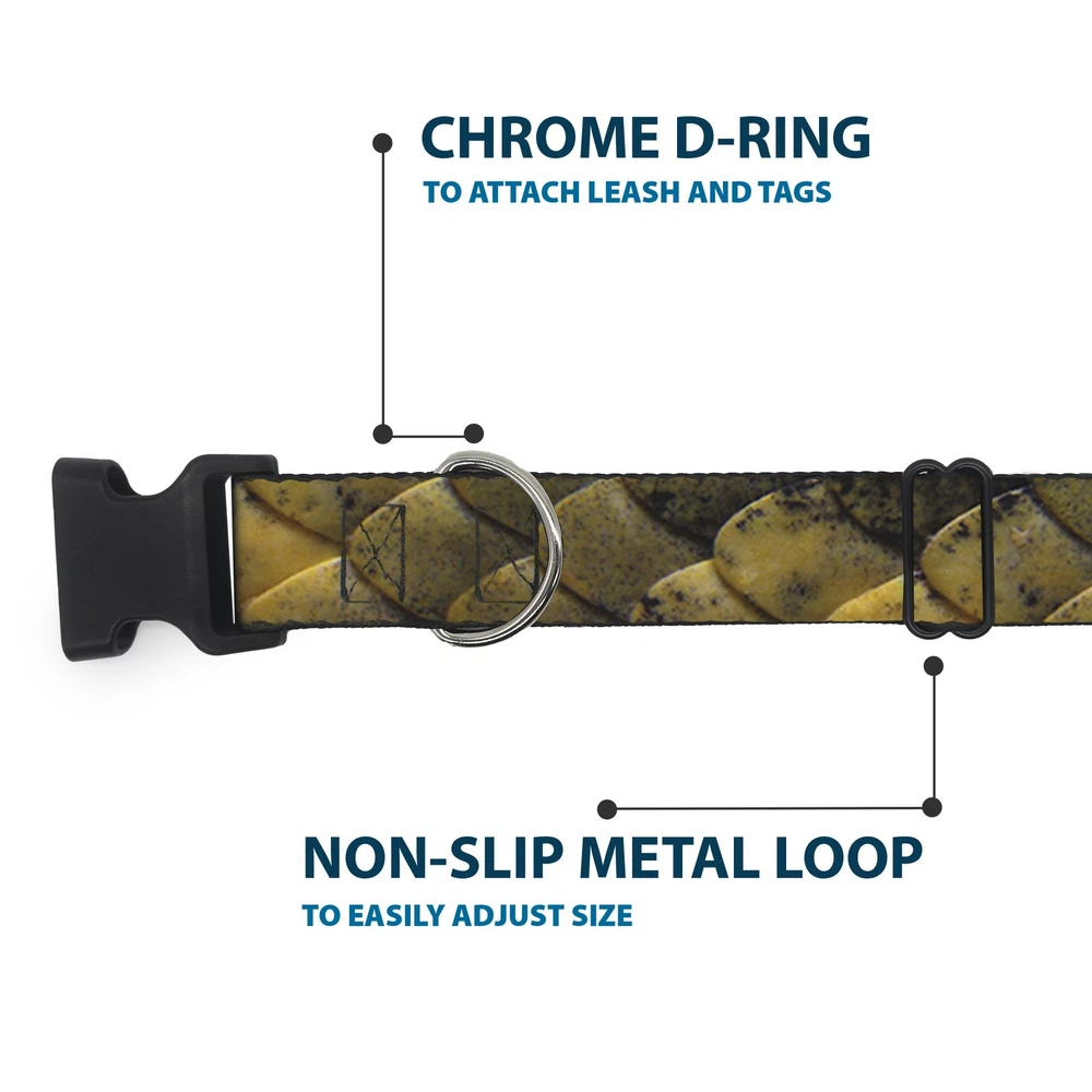 Further Details Title: Plastic Clip Collar Snake Skin CLOSE-UP WIDE-Medium 16-23" Condition: New Release Date: 03/16/2017 Item Weight: 85g Item Height: 25mm Age Level: All Life Stages Brand: Buckle-Down Designs MPN: W34589-1.5-M Item Length: 584mm Size: 1.5" Wide - Fits 16-23" Neck - Medium Number of Items: 18899 Type: Dog Collar Plastic Clip Buckle Material: Nylon Pattern: Dog Dimensions: 23 x 1.5 x 1 inches; 3 ounces Item Width: 38mm Description: Vibrant and bold, this beautiful, polyester dog collar is made to show off your dog's unique style through all the seasons. With an overengineered plastic buckle and strong D-ring, this durable collar can hold up to whatever your dog can dish out. This product is officially licensed by Buckle-Down. Color: Yellow Closure: Buckle Dog Breed: All Breed Sizes Fits 16-23" neck size and is 1.5" wide. Vibrant and bold, this beautiful polyester dog collar is made to show off your dog's unique style through all the seasons. With an overengineered plastic buckle and strong D-ring, this durable collar can hold up to whatever your dog can dish out. This product is assembled in the USA by Buckle-Down and is officially licensed by Buckle-Down. Matching leads/leashes available Missing Information? Please contact us if any details are missing and where possible we will add the information to our listing.