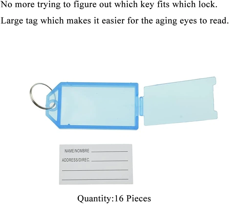 Size: 2.2x1.18 inches-Blue 16 Pcs Material: Plastic Item Weight: 3.2 ounces Color: Blue Material Type: Plastic Manufacturer Part Number: 2021071504-KeyTags Brand: Does not apply Type: Does not apply Shape: Rectangular Package Dimensions: 7.05 x 4.57 x 0.71 inches Item model number: 2021071504-KeyTags