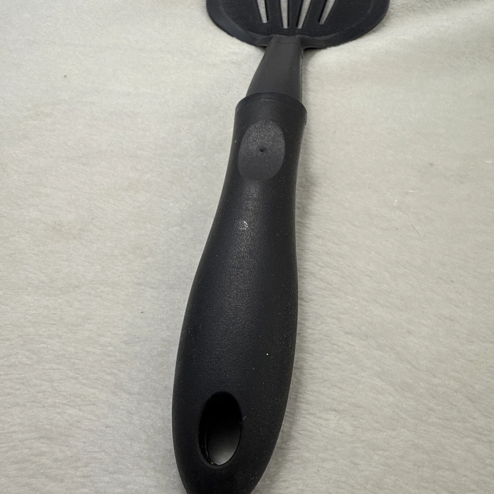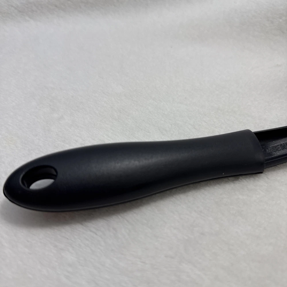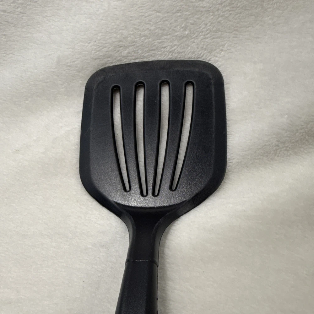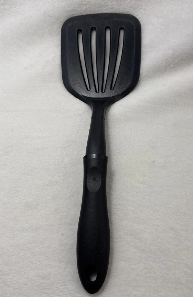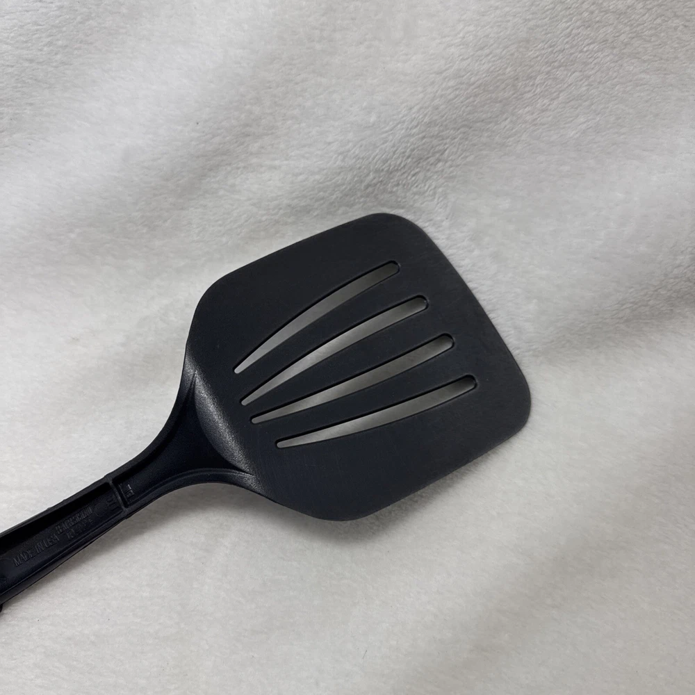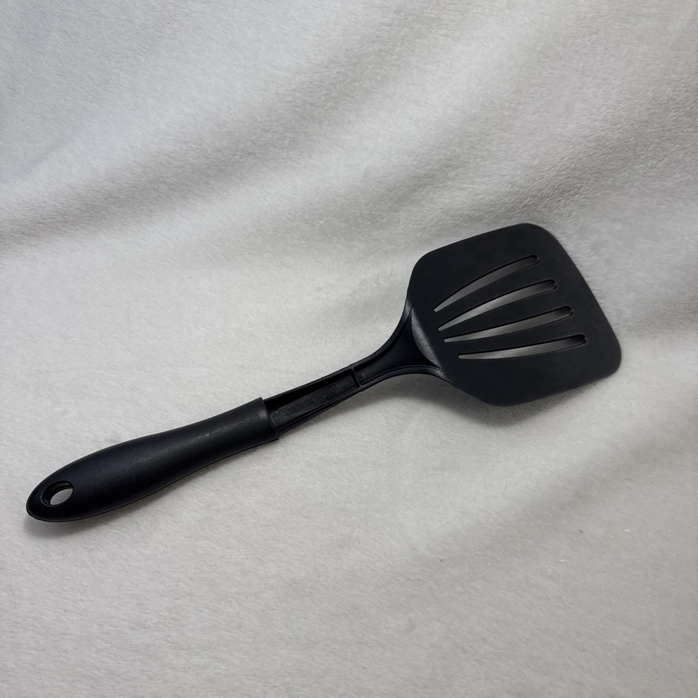 This is a 12-inch black nylon spatula/flipper made in the USA, suitable for use in high heat up to 400 degrees Fahrenheit. It is designed with a heavy-duty construction and features a rubber grip handle for comfortable use.