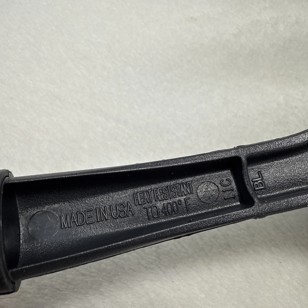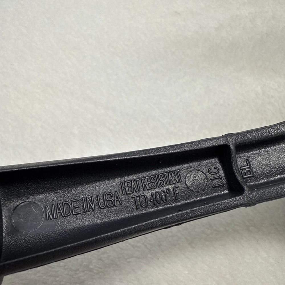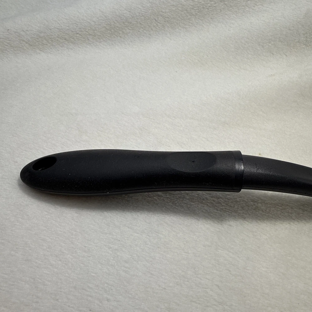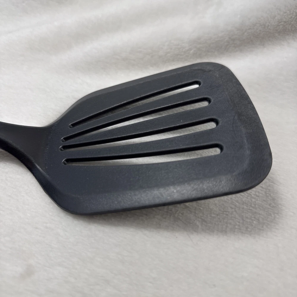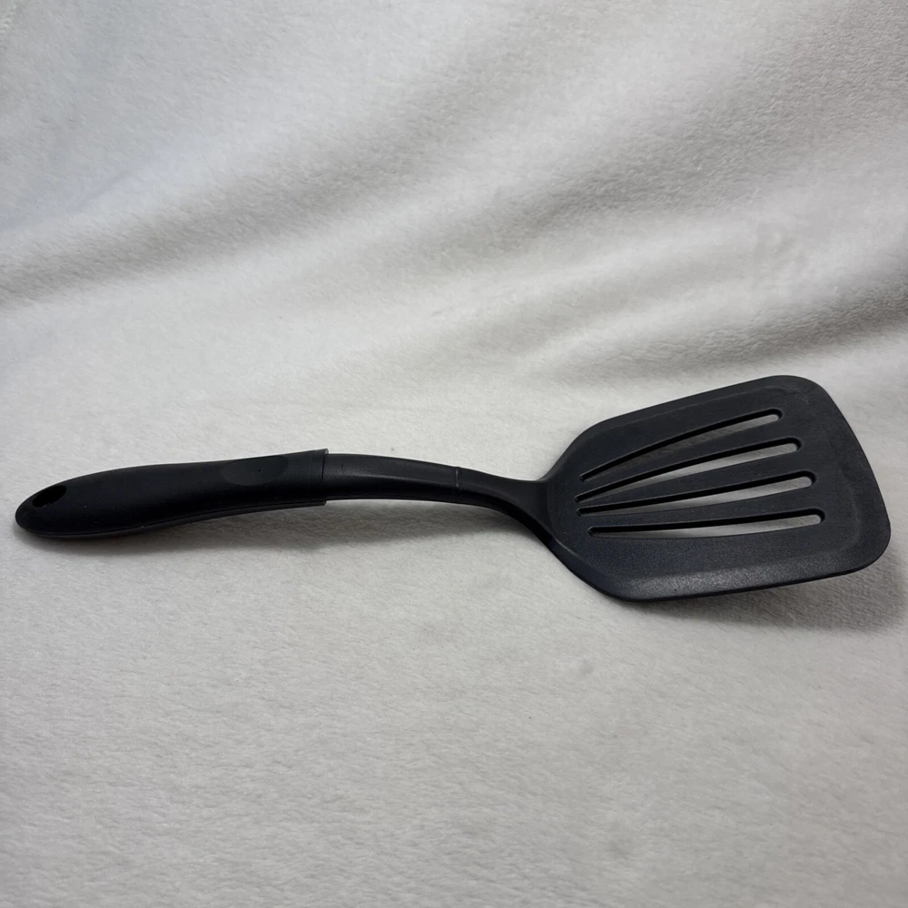 This is a 12-inch black nylon spatula/flipper made in the USA, suitable for use in high heat up to 400 degrees Fahrenheit. It is designed with a heavy-duty construction and features a rubber grip handle for comfortable use.