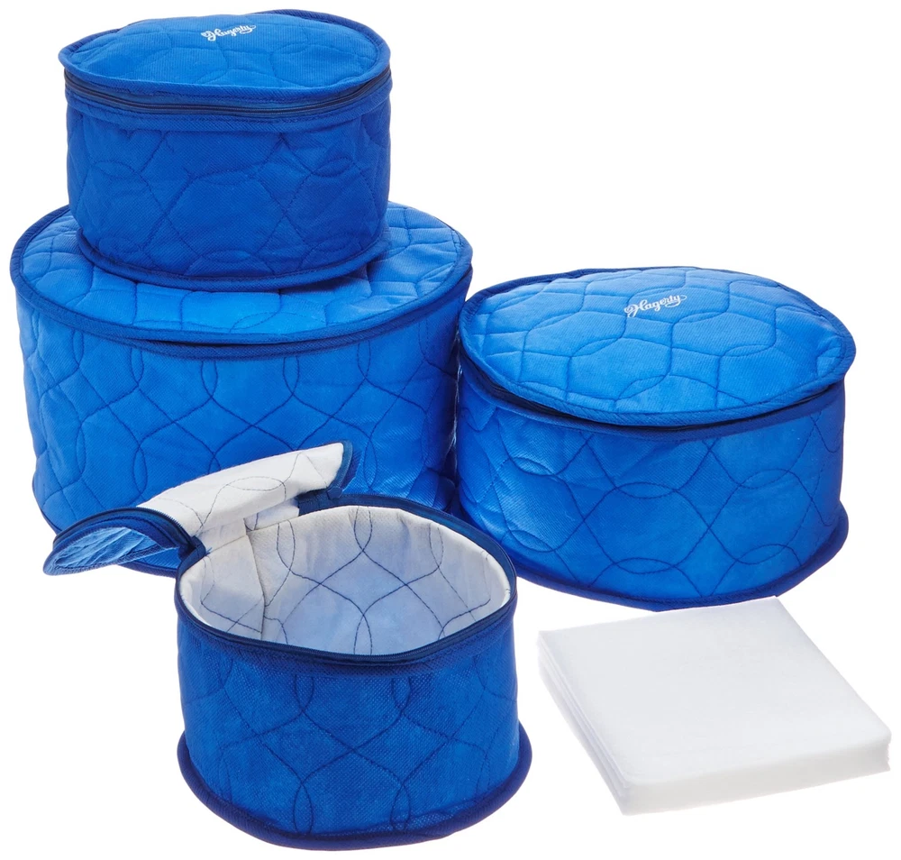 Keep your delicate plates safe from scratches and cracks by placing them in this wonderful Blue 4 Piece Plate Saver Set by . Made from soft, quilted cotton, this set of 4 protectors offers padding to cushion your delicate china. The top loading design makes for easy placement and quick access. The lid seals shut using a nylon zipper, keeping dust and moisture out. The 4 piece set safely stores 48 plates: 12 saucer plates, 12 dessert plates, 12 salad plates and 12 dinner plates. All cases come equipped with foam dividers so your precious collection won't chip or scratch while nested inside. Sizes to fit 7-inch, 8-inch, 9-inch and 11-1/2-inch plates Soft, quilted cotton construction Protects against scratches, chips, dust and moisture Each unit has a durable nylon zippered lid Inserts to place between plates for extra protection